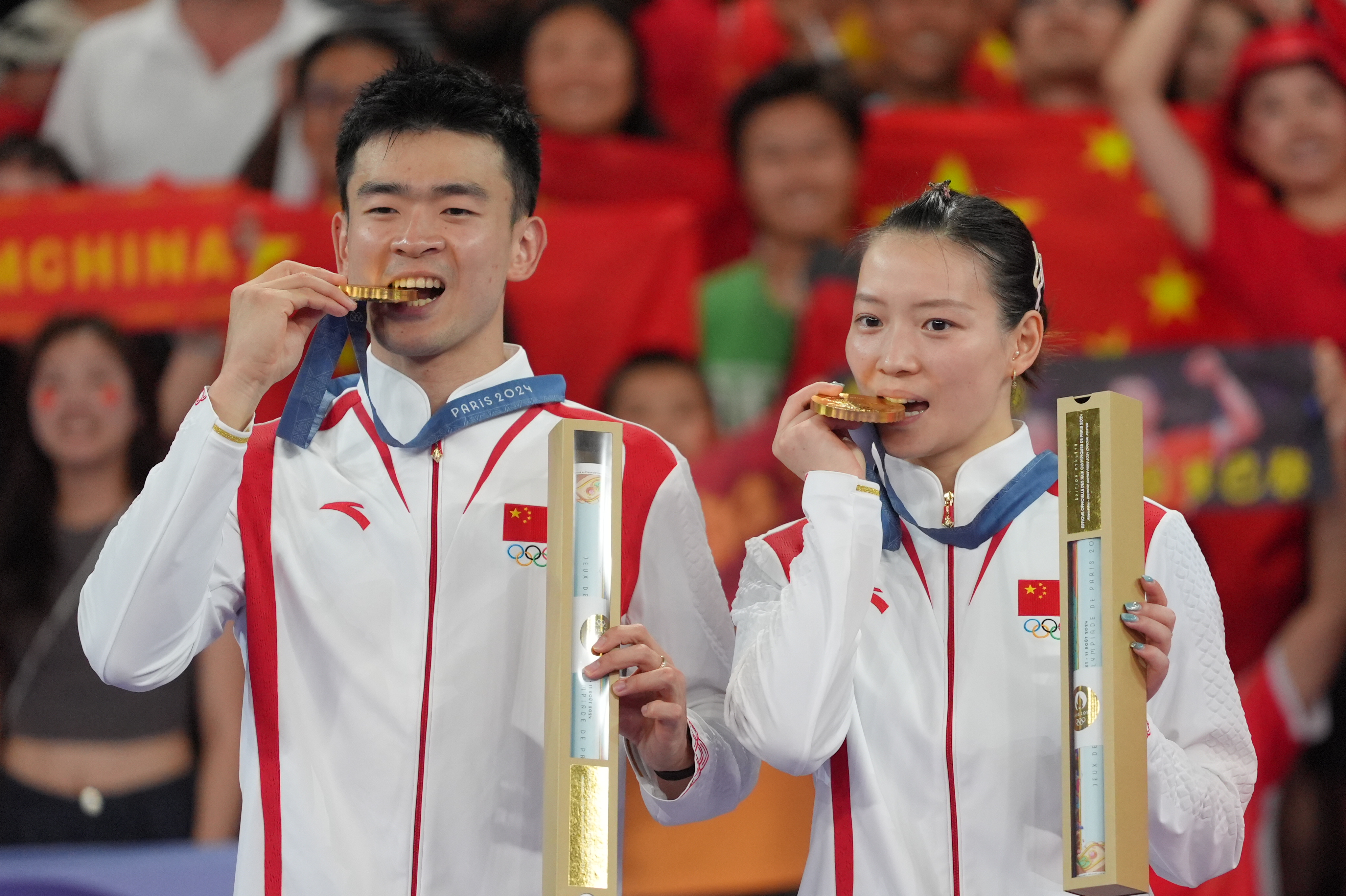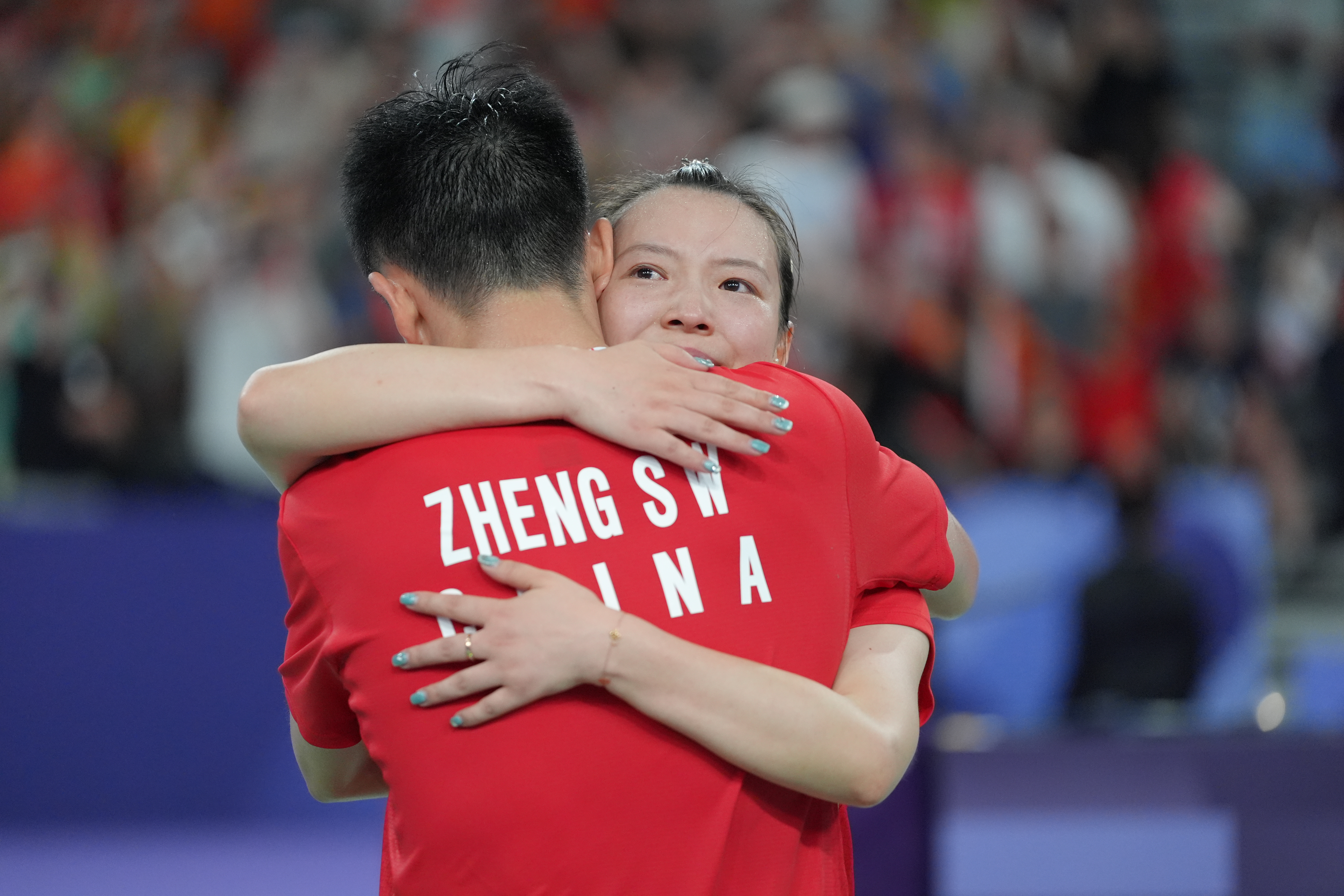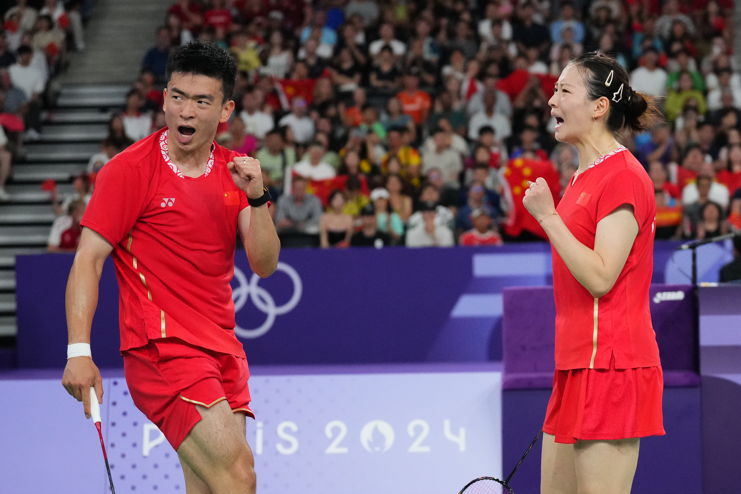 2日,在巴黎奥运会羽毛球混合双打决赛中,中国组合郑思维/黄雅琼以2比0胜韩国组合金元昊/郑娜银,获得金牌。图为郑思维/黄雅琼(右)庆祝夺冠。(图片来源:图片均据中新社)