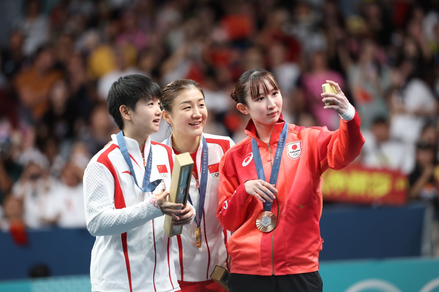 图为陈梦(中)、孙颖莎(左)、日本选手早田希娜(右)在颁奖仪式后自拍。