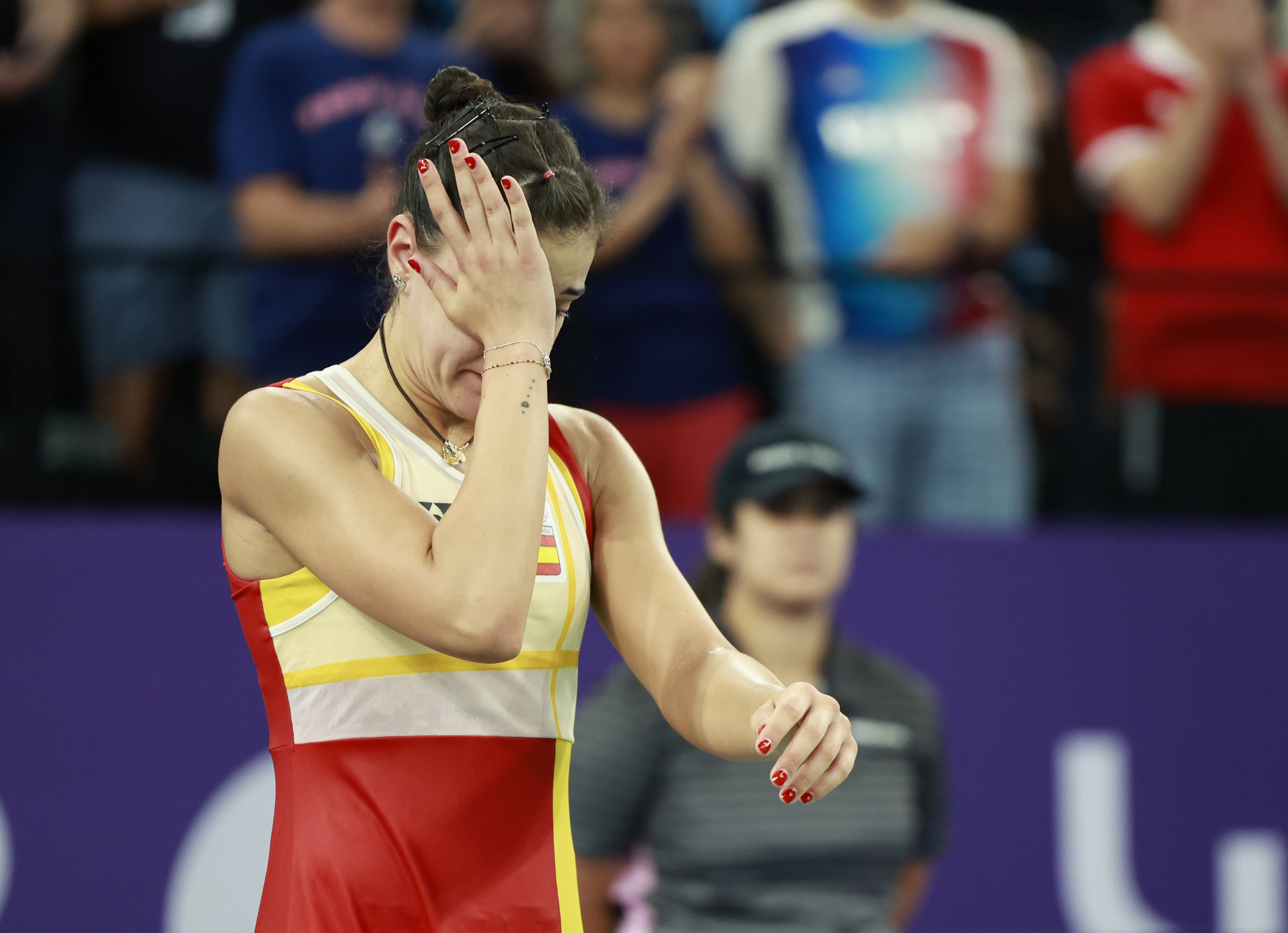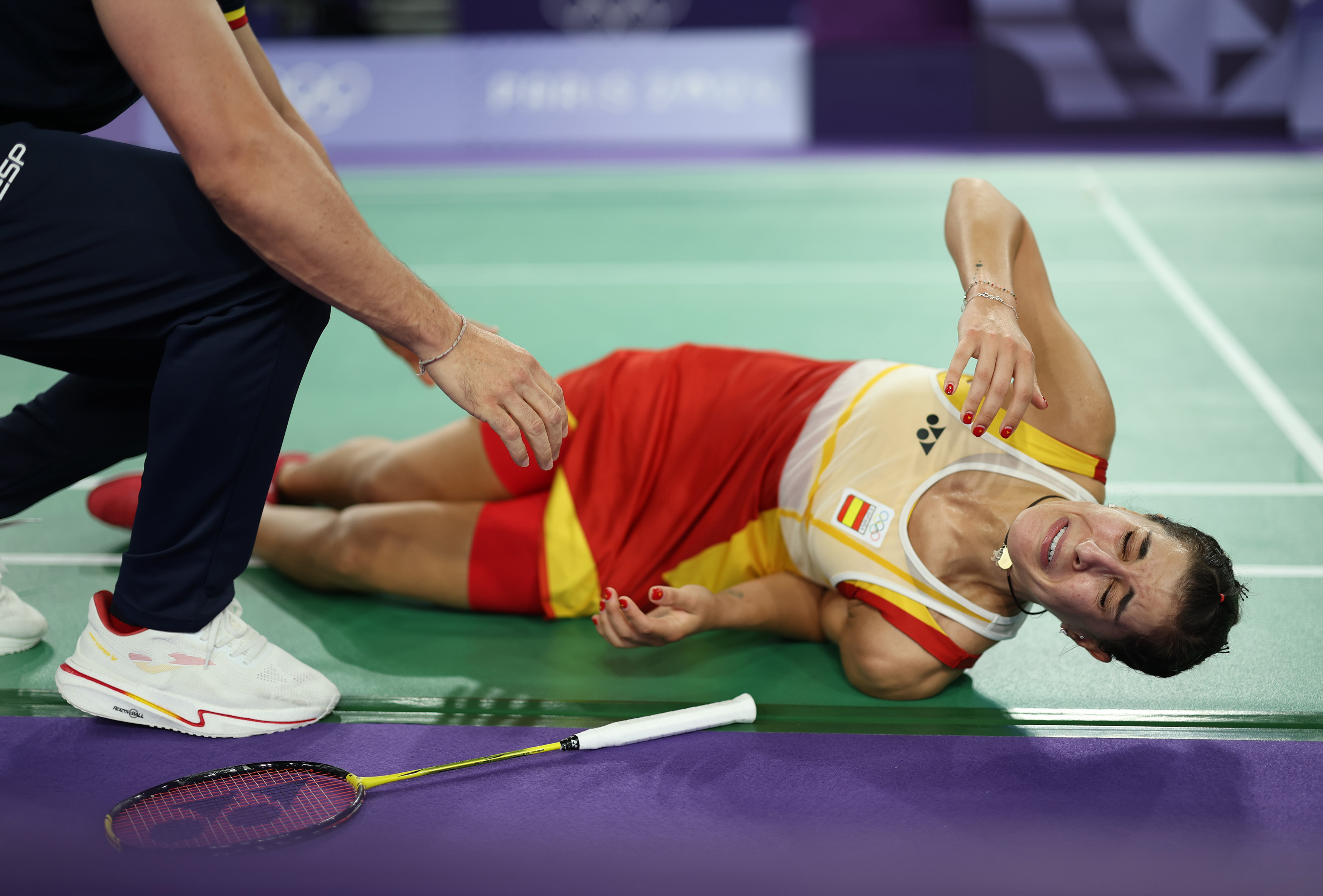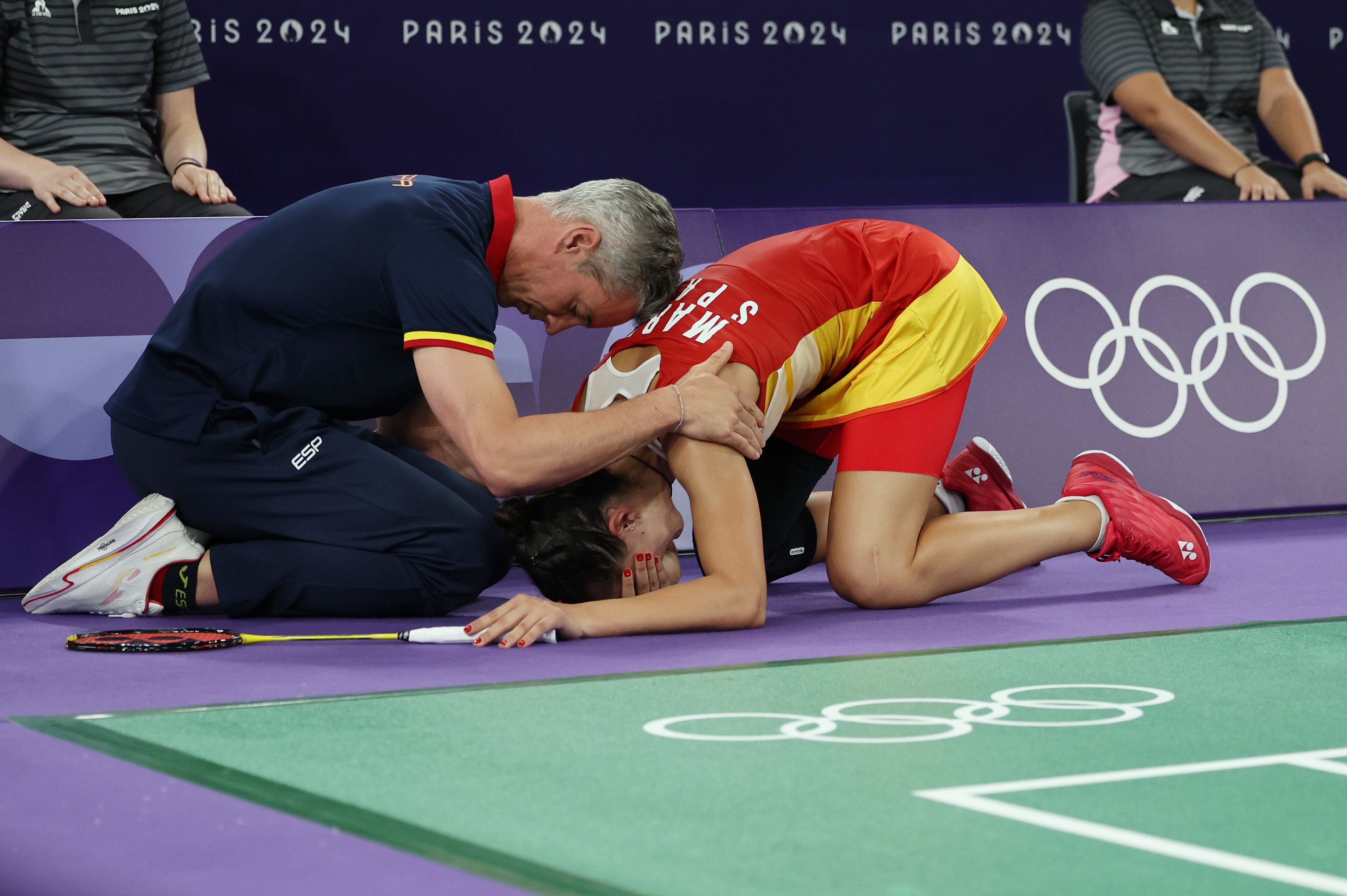 4日,在巴黎奥运会羽毛球女子单打半决赛中,西班牙选手马林因伤退赛,中国选手何冰娇进入决赛。图为马林在受伤后落泪。(图片来源:图片均据新华社)