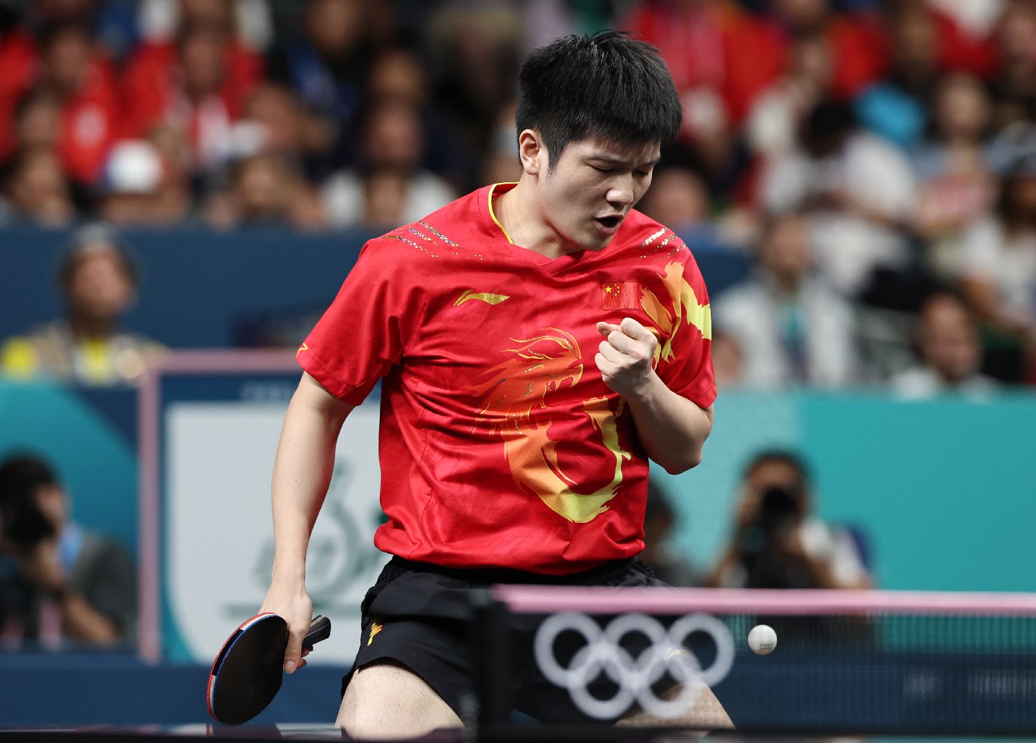 图为樊振东在比赛中庆祝得分。