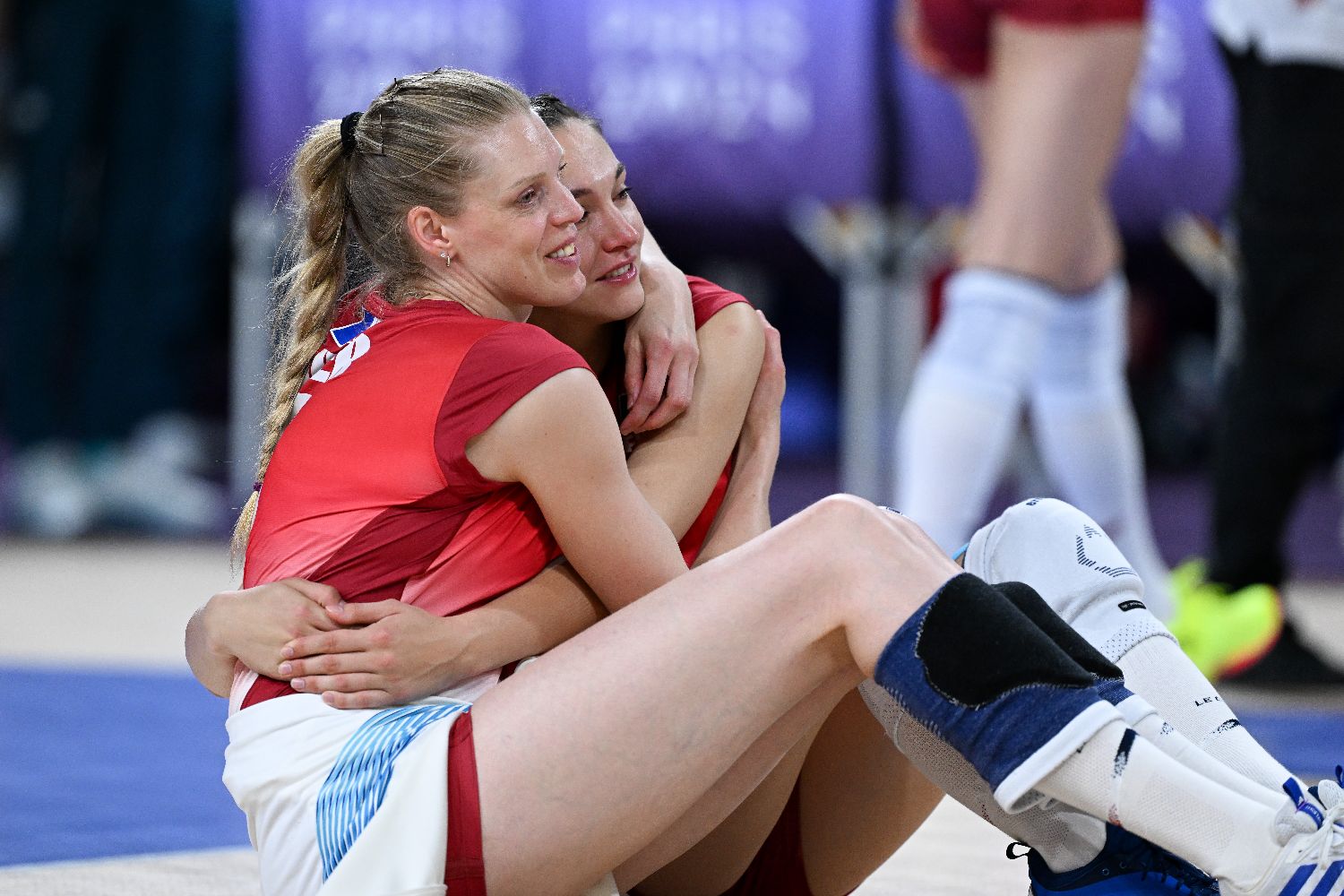 图为法国队选手博尔(左)与队友卡扎特在比赛结束后拥抱在一起。