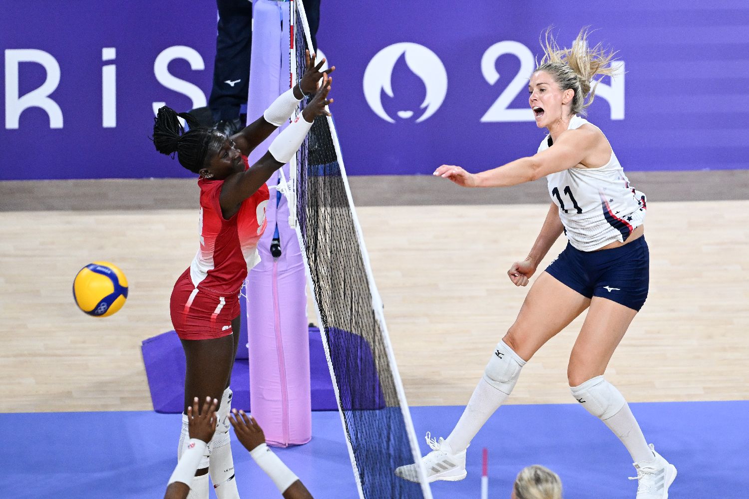 4日,在巴黎奥运会女子排球小组赛A组比赛中,美国队3比0战胜法国队。图为美国队选手德鲁斯(右)在比赛中扣球。(图片来源:图片均据新华社)