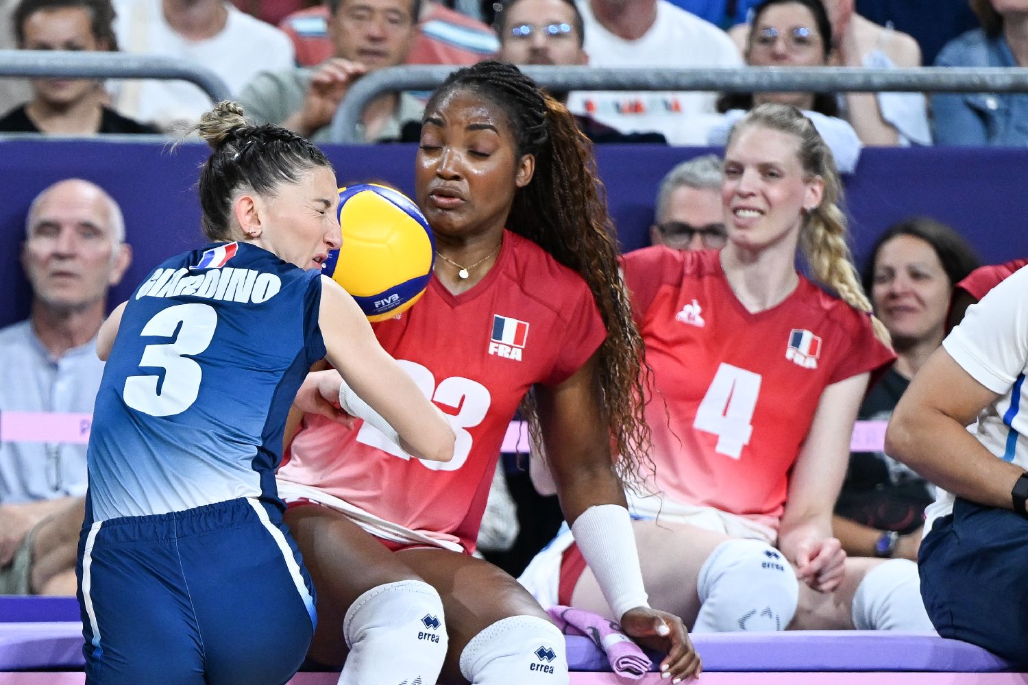 图为法国队选手贾尔迪诺(左一)在比赛中救球时与替补席上的队友撞在一起。