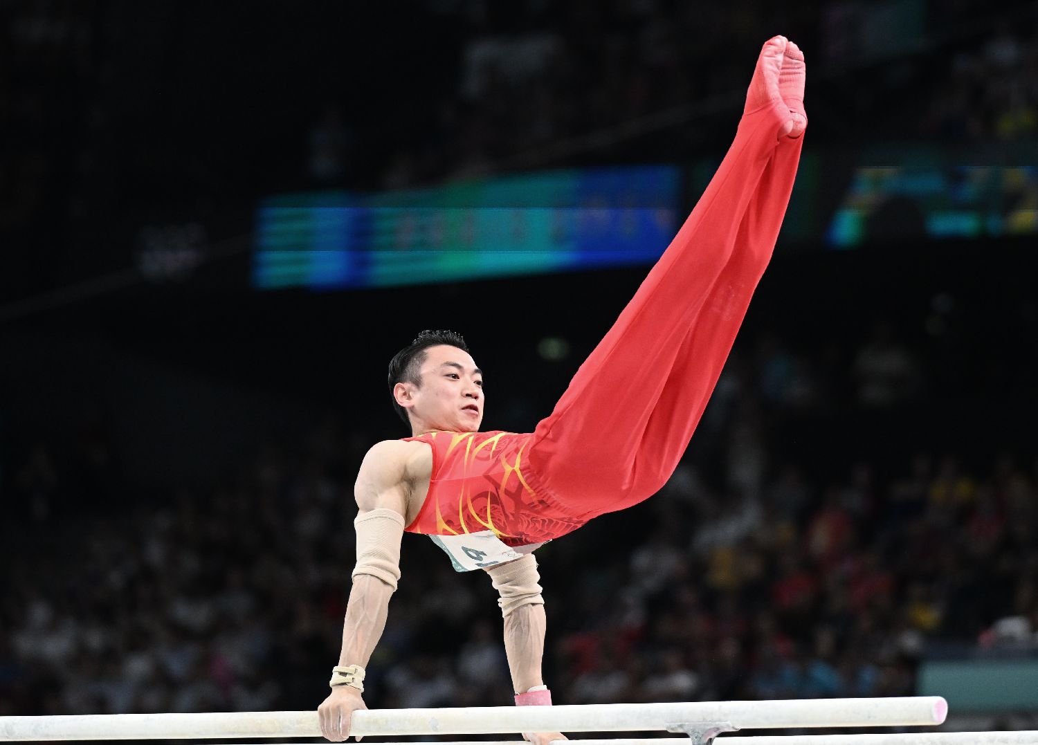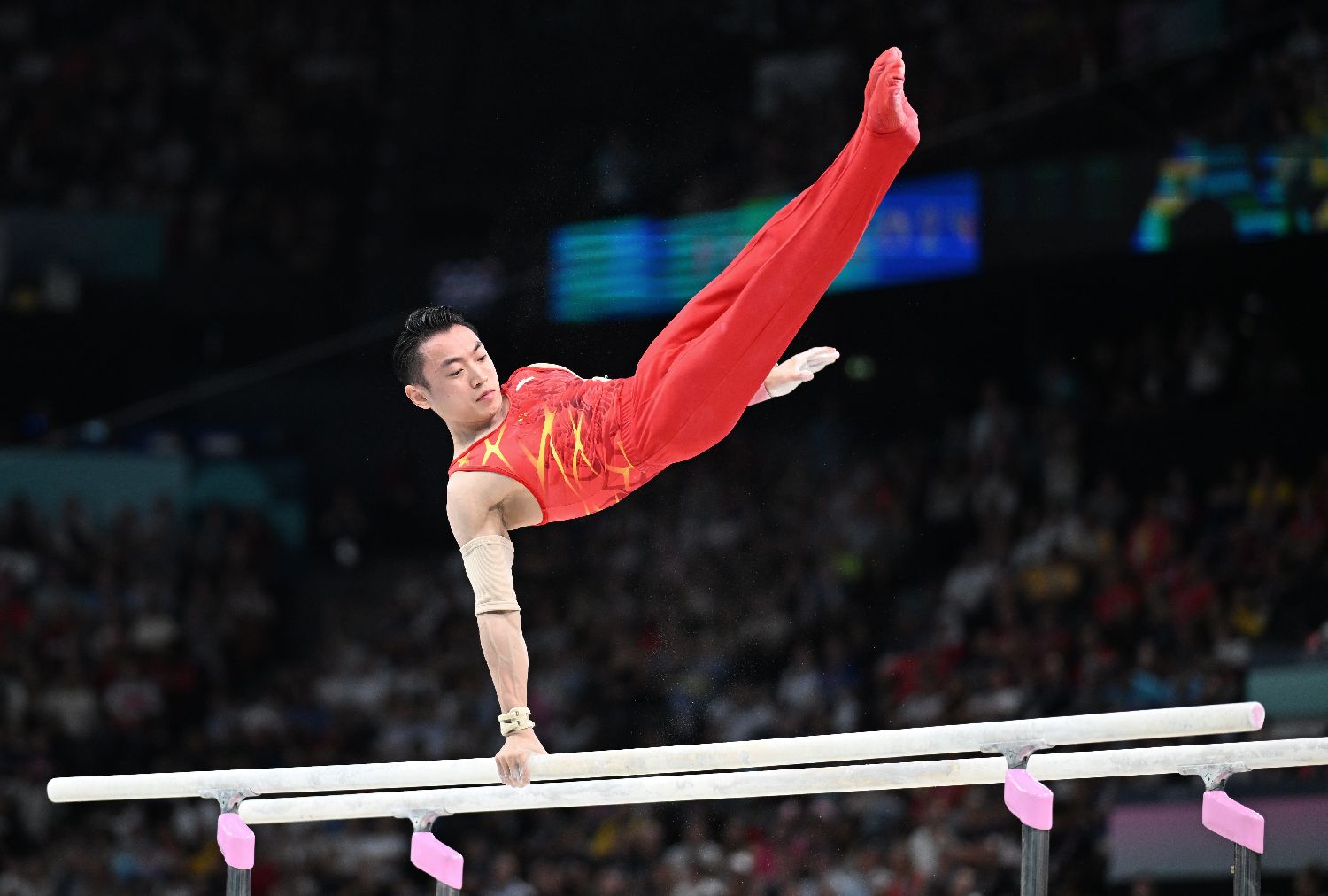 在5日结束的巴黎奥运会体操男子双杠决赛中,中国选手邹敬园夺得金牌,成功卫冕。图为邹敬园在比赛中。(图片来源:图片均据新华社)