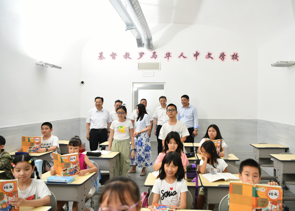 意大利《华人街》(孙玮报道):正在意大利罗马考察的中国侨联代表团一行8月6日走访了罗马基督教中文学校,代表团团长、中国侨联副主席程学源向校长、意大利中国总商会会长黄智晓了解学校的发展现状,他走访各个教室,倾听孩子们的朗读声,与孩子们交流学习感受。他强调,中文教育是海外侨胞的根,海外华文学校已不再是简单的语言培训机构,而是连接华社与海外社会的重要桥梁,承担着培养高素质华裔新生代的重要任务。他询问了学校师资和教材的情况,表示,中国侨联全面支持海外中文学校,你们有什么要求和困难可以向我们反映。