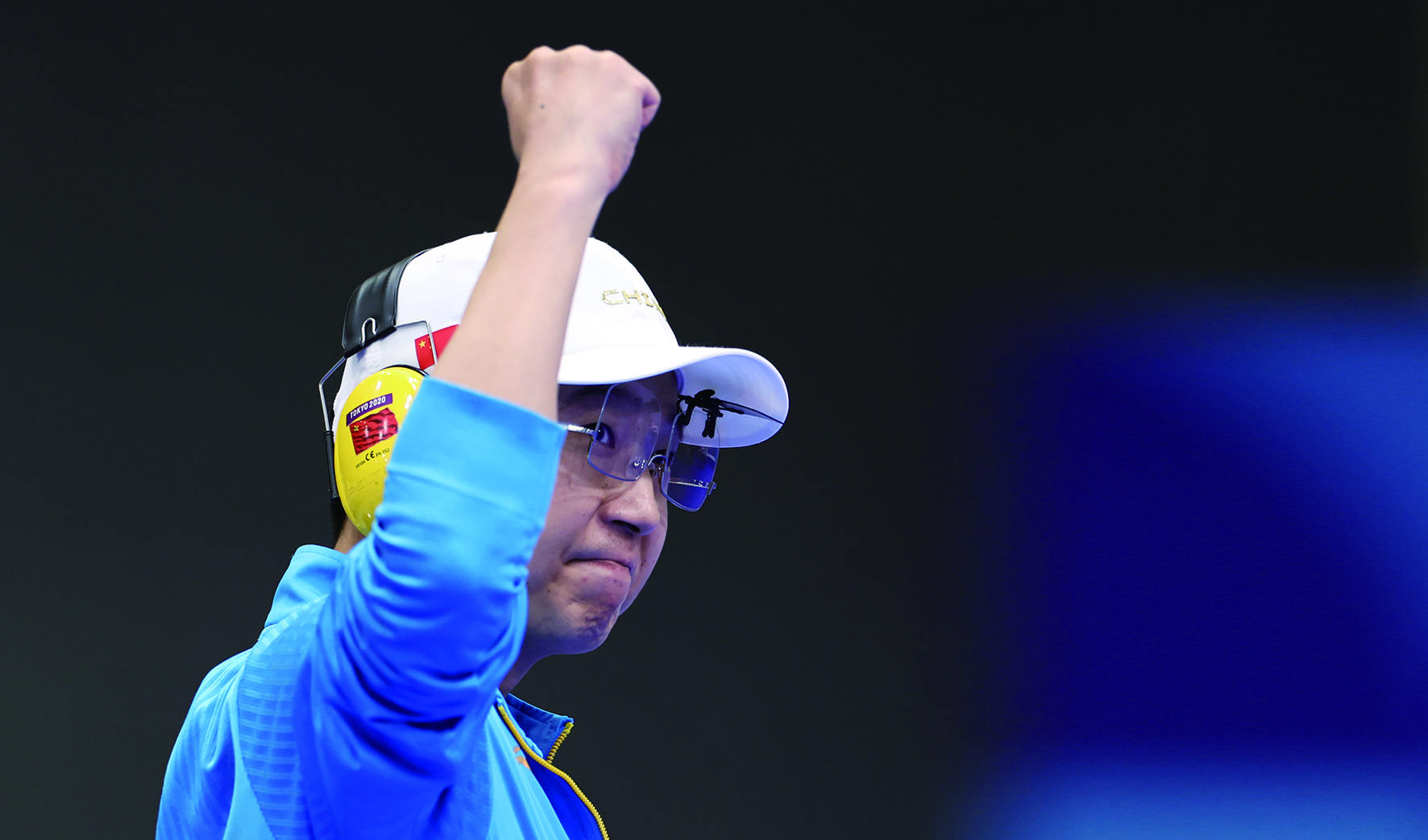 在射击男子25米手枪速射决赛中,三届奥运老将李越宏庆祝夺冠。(图片来源:新华社)