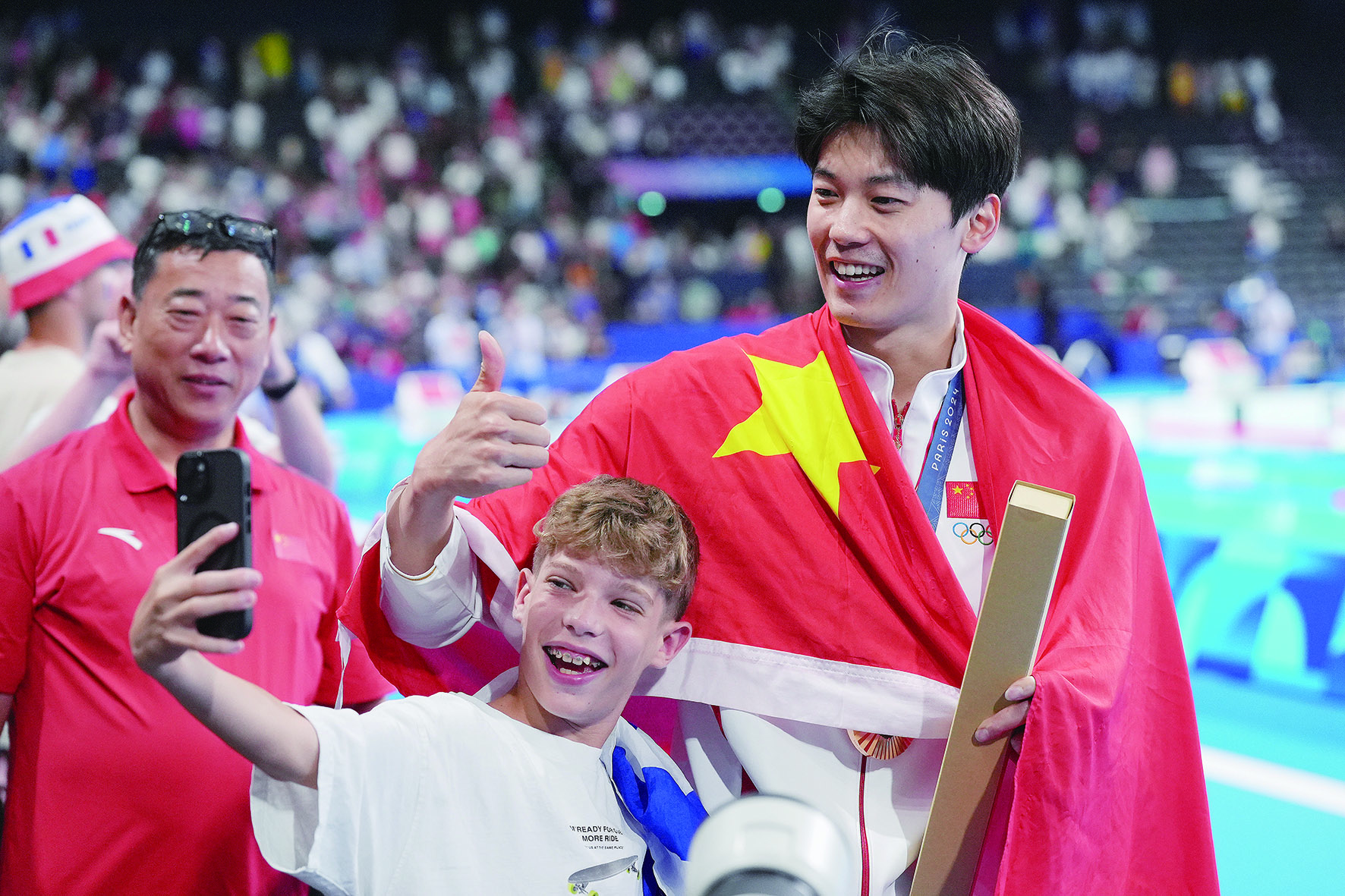 中国选手汪顺赛后与小粉丝合影。(图片来源:中新社)