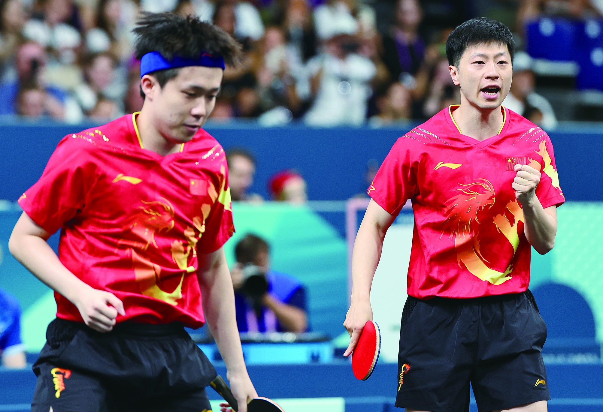 中国选手马龙、王楚钦在男子团体16强乒乓球比赛中。(图片来源:新华社)