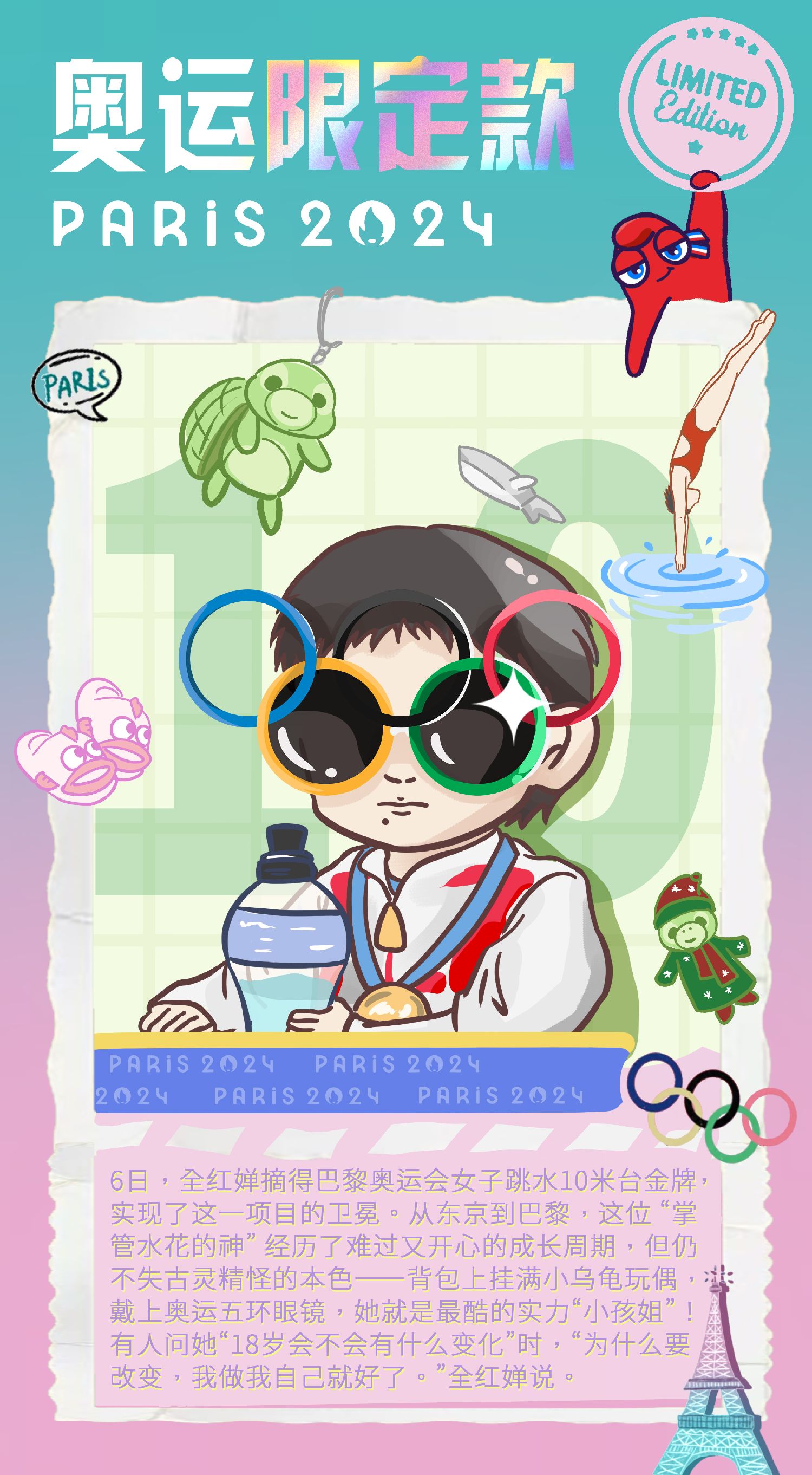 【欧洲时报网】凭借“水花消失术”,在6日的巴黎水上运动中心,全红婵摘得巴黎奥运会女子跳水10米台金牌。得知最终成绩时,她与主管教练陈若琳相拥而泣。来到赛后的新闻发布会上,全红婵戴上了奥运五环眼镜,搞怪又酷炫的模样几乎让人忘了她只是个未成年的实力“小孩姐”。