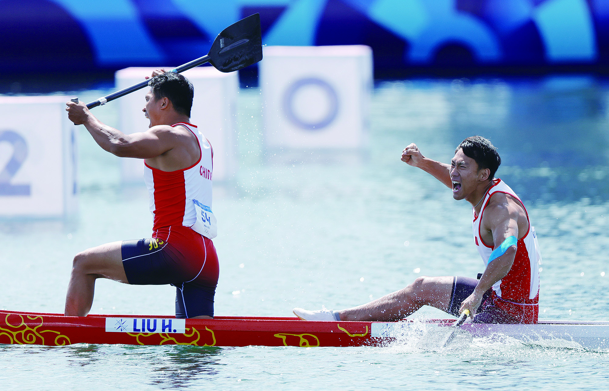 在皮划艇静水男子双人划艇500米决赛中,中国选手刘浩(左)、季博文夺金后庆祝。(图片来源:新华社)