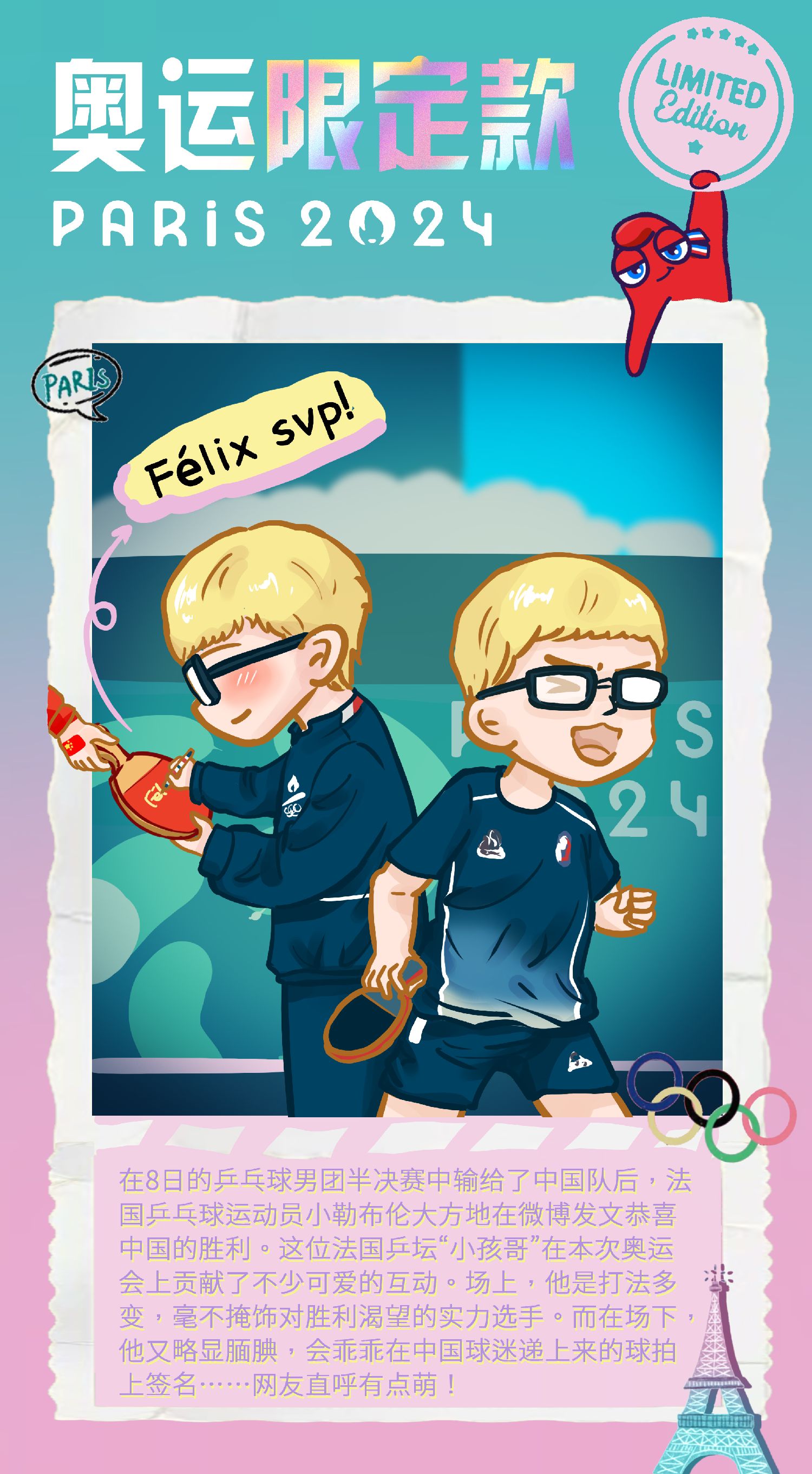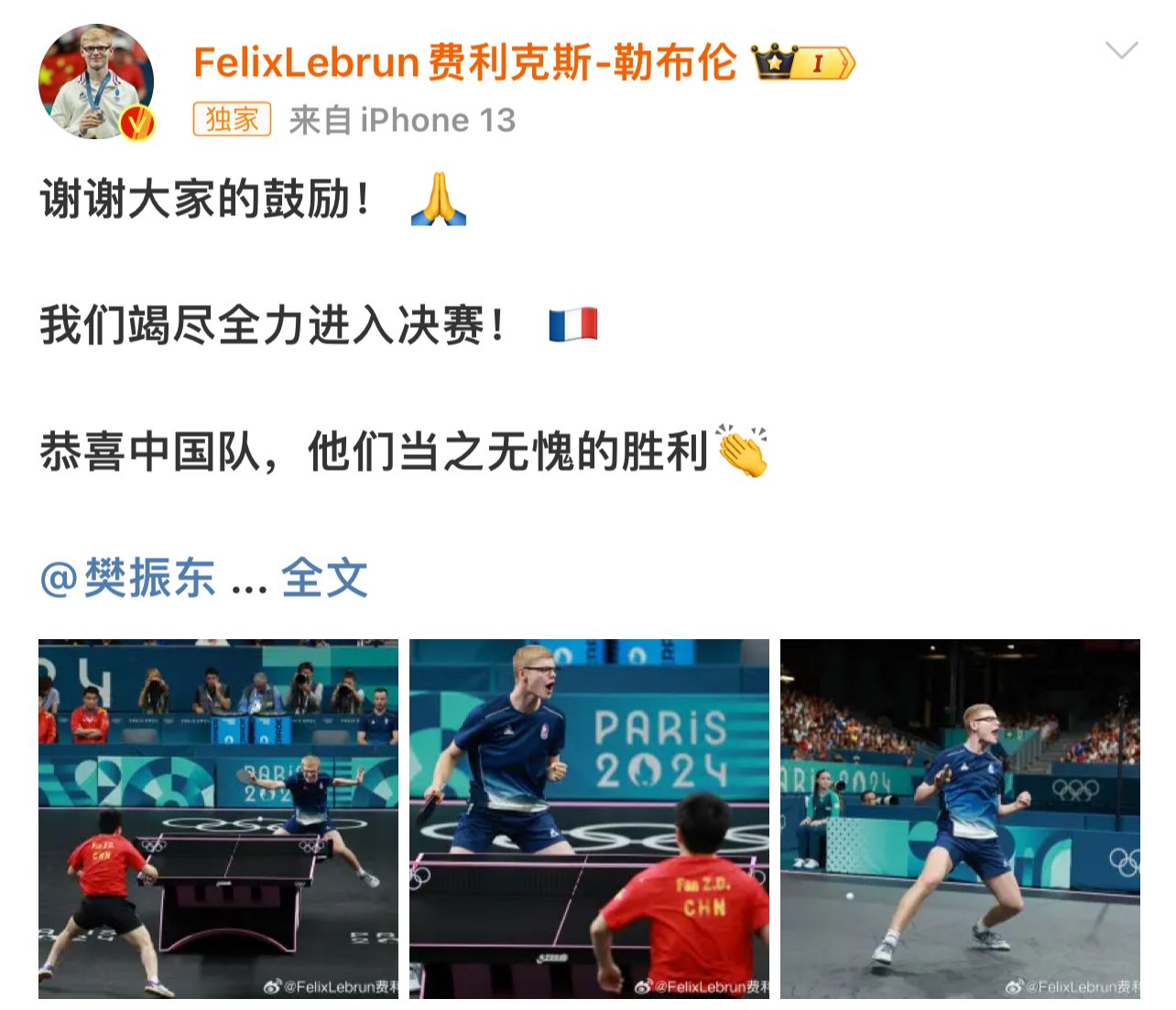 【欧洲时报网】在8日的乒乓球男团半决赛中输给了中国队后,法国乒乓球运动员菲利克斯·勒布伦(小勒布伦)大方地在微博发文恭喜中国队的胜利,并称一定要赢得铜牌。而在9日,小勒布伦如愿以偿。