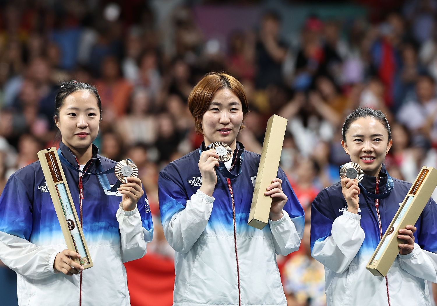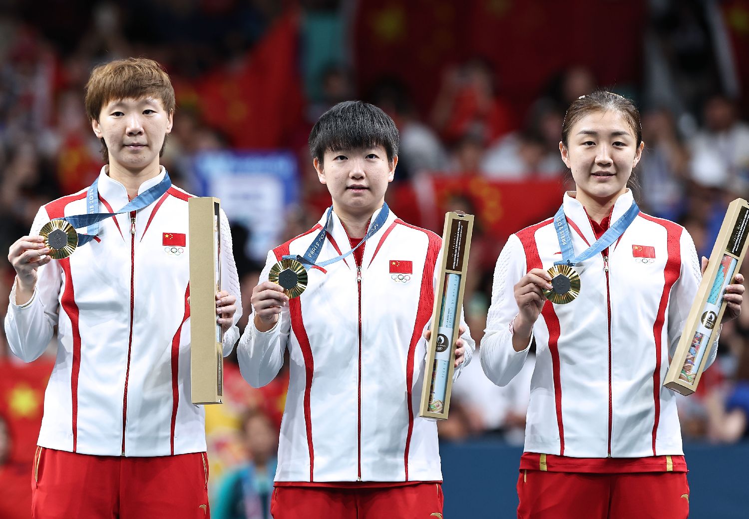 8月10日,冠军中国队选手王曼昱、孙颖莎、陈梦(从左至右 )在颁奖仪式上。当日,在巴黎奥运会乒乓球女团金牌赛中,中国队3比0战胜日本队,获得冠军。(图片来源:本文图片均自新华社)