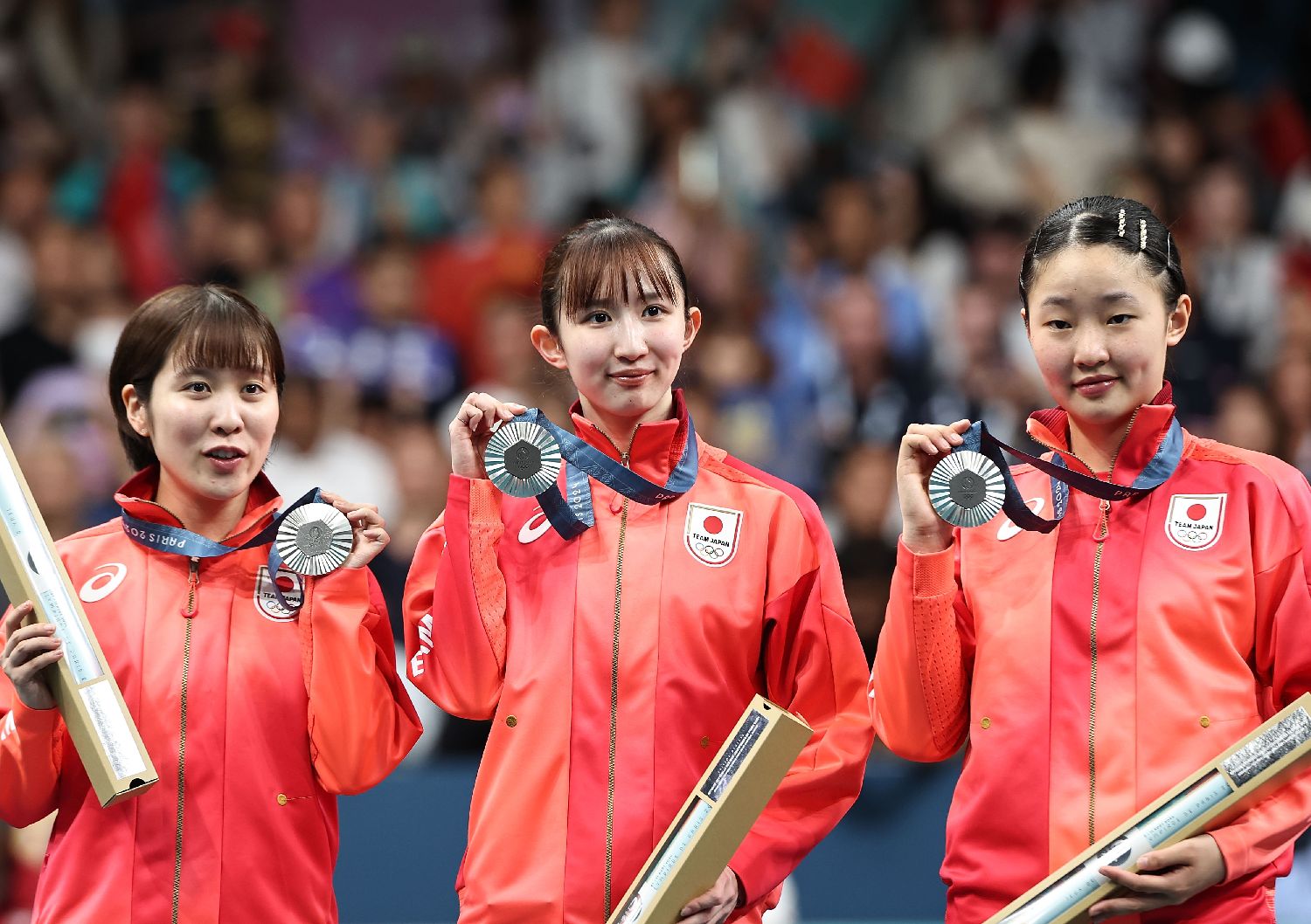 8月10日,亚军日本队选手平野美宇、早田希娜、张本美和(从左至右)在颁奖仪式上展示奖牌。