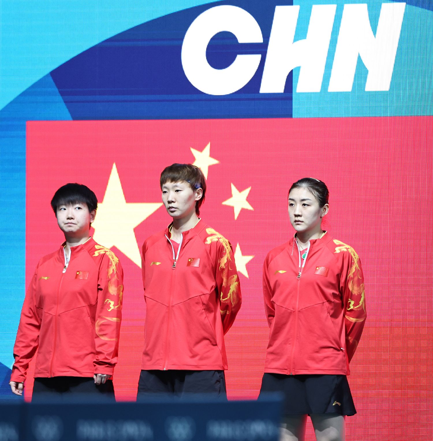8月10日,中国队选手孙颖莎、王曼昱、陈梦(从左至右)赛前亮相。