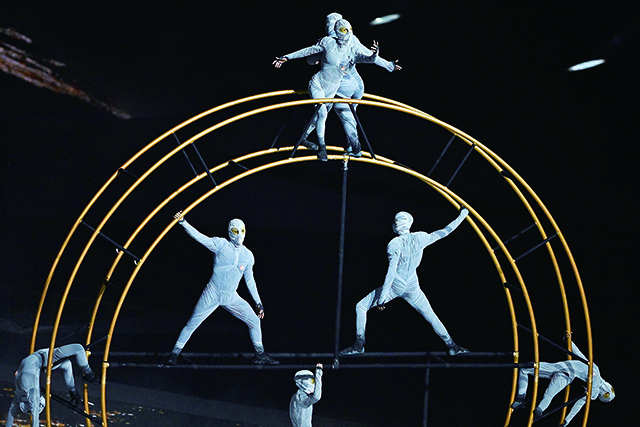 之后便正式进入表演环节。长达40分钟,名为《记录》的表演结合了“惊叹”和“反乌托邦”(描述末日世界黑暗的风格)。一位金色旅行者缓缓现身,从天而降。来自遥远未来的他发现了奥林匹克运动会的遗迹,并开始重建奥林匹克运动会。奥林匹克五环在从法兰西体育场的地面被挖掘出来后,缓缓升至体育场中央的空中,烟花随即绽放。