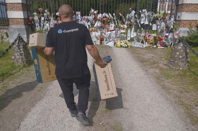 法国国宝级电影明星阿兰·德龙于8月18日辞世,享年88岁。8月20日,数百名影迷前往位于Douchy的阿兰·德龙宅邸La Brulerie献花,以此表达爱戴。小儿子阿兰·法比安·德龙当天也来到此处,眼含泪水浏览镇上居民和影迷给父亲留下的无数鲜花和留言。还有影迷不能亲自到场,远程预定鲜花寄托哀思。图为一名Chronopost的邮政员工将鲜花送到门前。法新社图