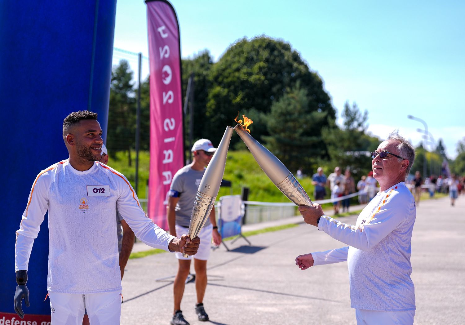 8月27日,火炬手帕斯卡尔·贝朗热(右)和阿兰·阿卡波进行火炬传递。