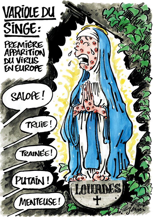 综合《20分钟报》《北方之声》报道,引发争议的漫画在8月16日,即法国宗教节日圣母升天节的次日发表。漫画的标题是“猴痘病毒首次出现在欧洲”。漫画画了一个哭泣的圣母玛利亚身上长满了由猴痘引起的脓疱,周围满是旁观者侮辱性的话语,如“婊子”“母猪”“骗子”“荡妇”“妓女”。这无疑是在讽刺病毒的传播方式,也就是通过性传播。漫画发表前一日,瑞典刚刚报告出现一例猴痘病例。