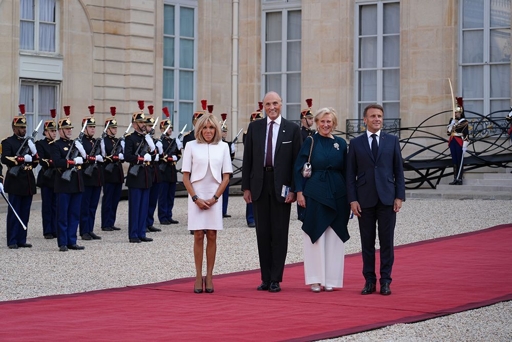 多位政府首脑和皇室成员如英国首相斯塔默、德国总统施泰因迈尔夫妇、捷克总统帕维尔、澳大利亚总督莫斯廷夫妇,摩纳哥元首阿尔贝二世亲王、比利时公主阿斯特丽德和其丈夫奥地利-埃斯特的洛伦茨大公,以及国际组织代表如国际奥林匹克委员会主席巴赫、巴黎奥组委主席托尼·埃斯坦盖等出席了接待会。