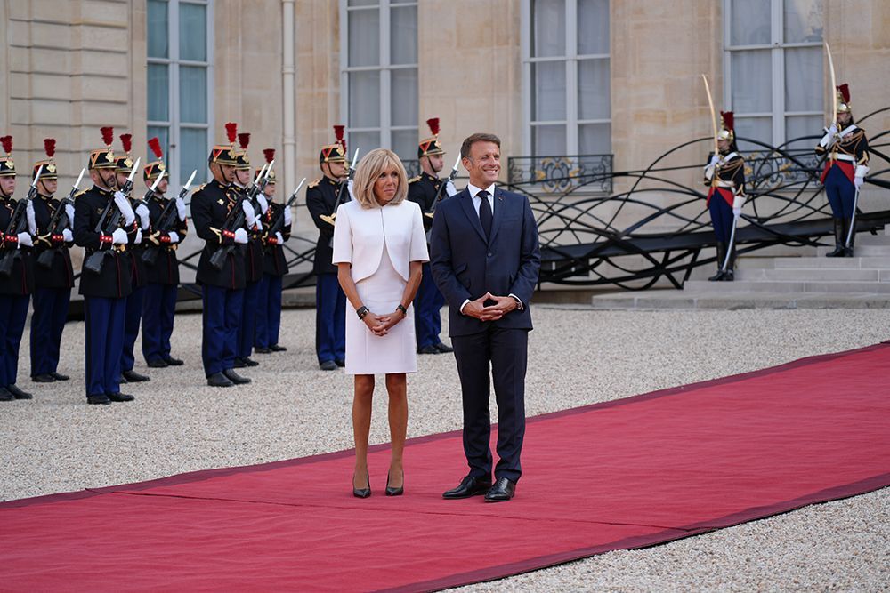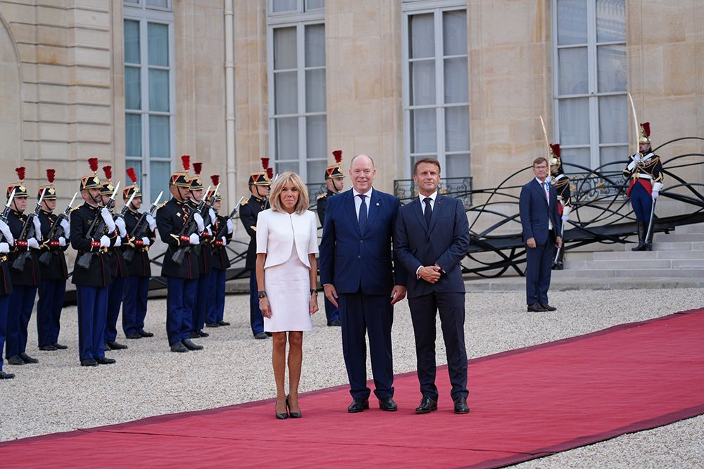 法国总统马克龙夫妇迎接摩纳哥元首阿尔贝二世亲王。