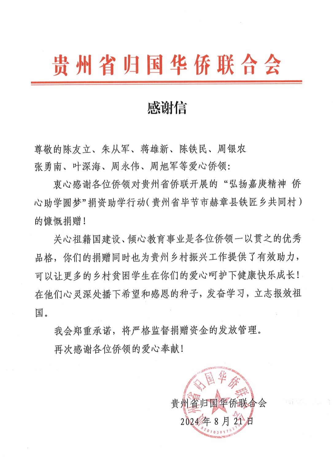 近日,贵州省侨联发来感谢信,贵州省侨联对这些侨领表达了深深的谢意,称赞他们不仅是海外侨胞中的优秀代表,更是心怀祖国、关心家乡建设的表率。这些善款将被严格管理,用于改善当地教育环境,帮助更多贫困学生实现他们的学习梦想,为乡村振兴贡献力量。