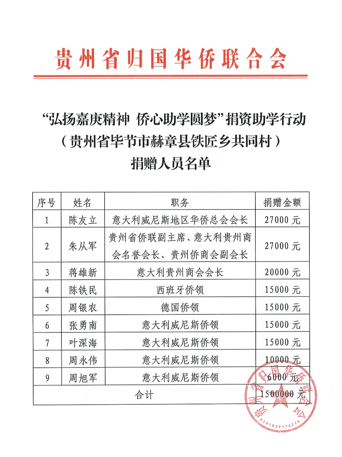 意大利《华人街》消息:在一场体现中外侨胞心系祖国、热心公益的捐资助学活动中,意大利贵州商会与多位侨领积极响应贵州省侨联的号召,慷慨解囊,为“弘扬嘉庚精神 侨心助学圆梦”行动注入了强大的支持力量。此次活动旨在帮助贵州省毕节市赫章县铁匠乡共同村的贫困学生,为他们的教育事业提供宝贵的援助。