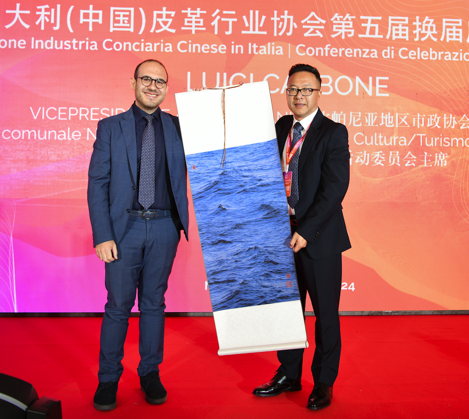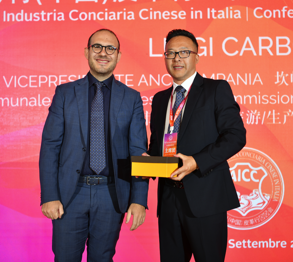 意大利(中国)皮革行业协会第五届会长许建成与坎帕尼亚地区市政协会副主席Luigi Carbone先生互赠礼品