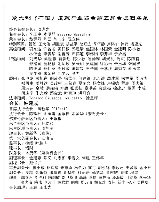 回顾过去,在历届会长团的不断努力下,今天的意大利(中国)皮革行业协会巳成为了一支在意大利侨界中的,不可或缺的重要的组成力量。