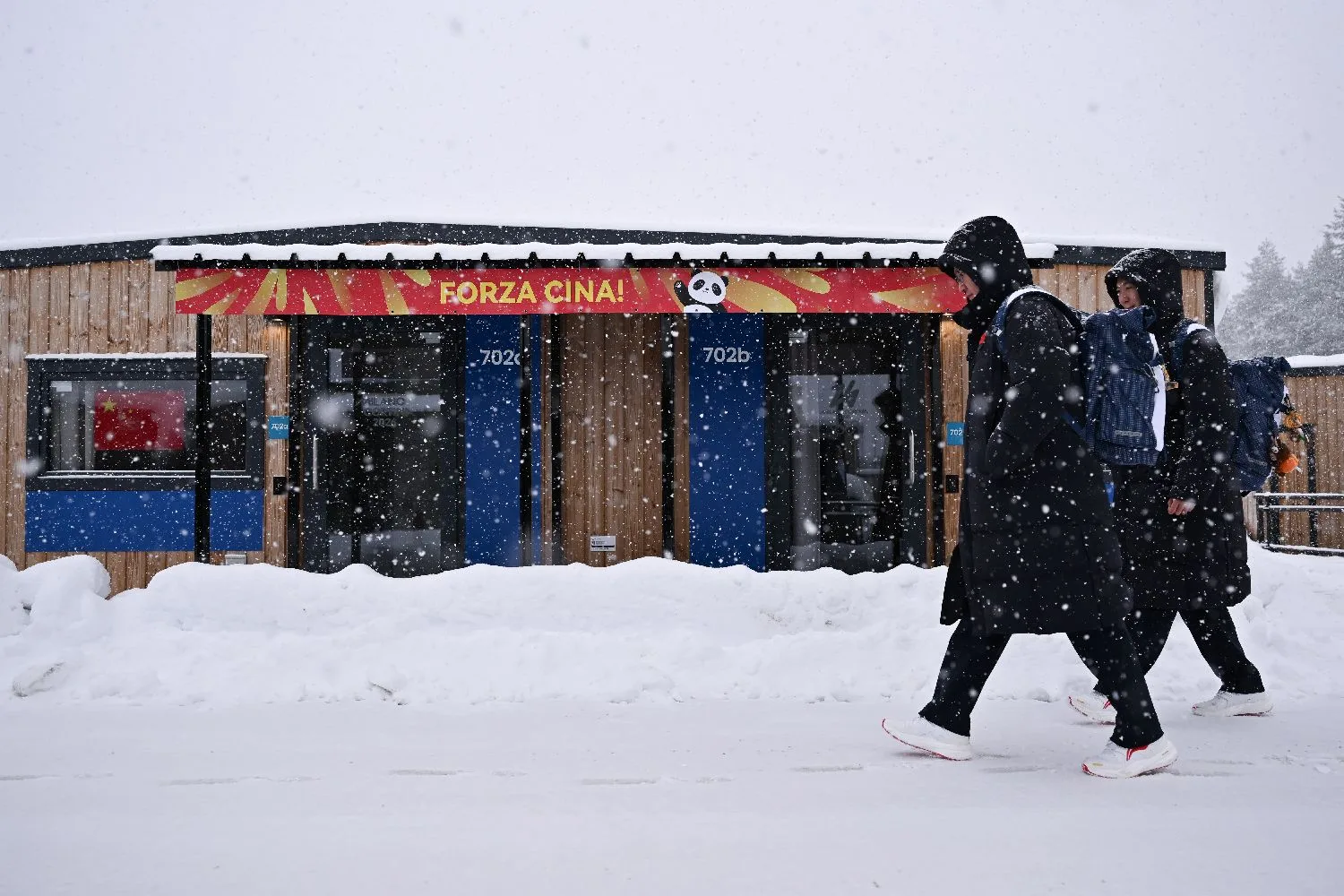 2月3日,中国体育代表团成员走在科尔蒂纳丹佩佐奥运村内。