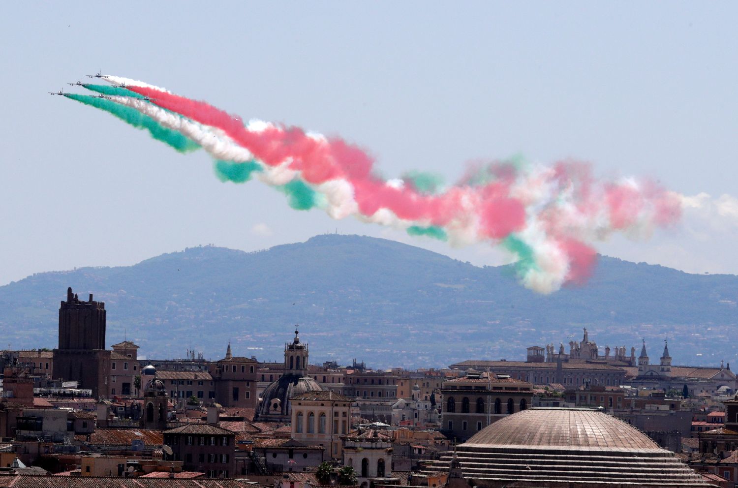 6月2日,意大利“三色箭”特技飞行表演队在共和国日庆祝活动中飞过罗马上空。