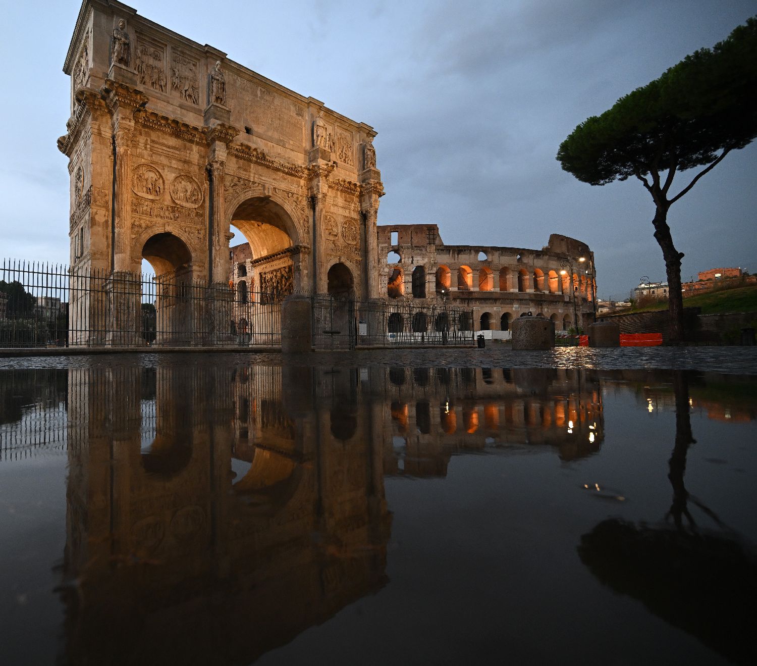 7月13日在意大利罗马拍摄的大雨后的君士坦丁凯旋门和斗兽场。
