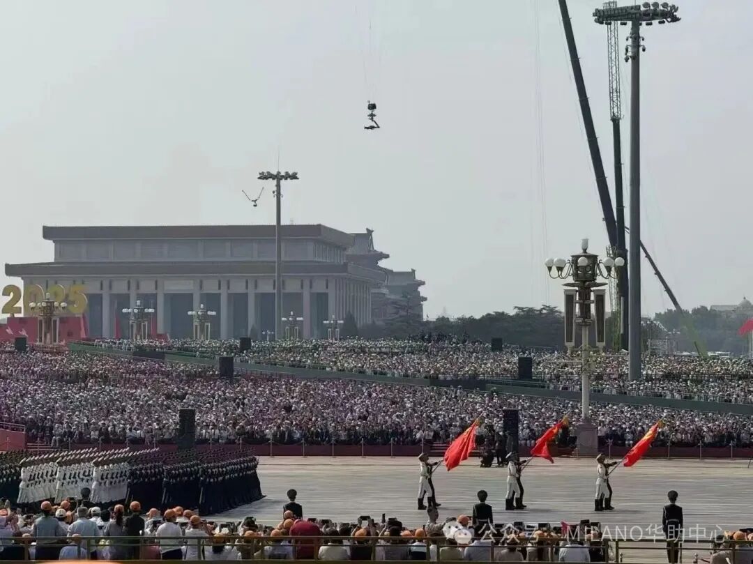 当天上午,阅兵式在庄严的国歌声中拉开帷幕。作为应邀嘉宾,米兰侨界代表团与来自世界各地的海外华侨华人齐聚一堂,共同仰望五星红旗冉冉升起。