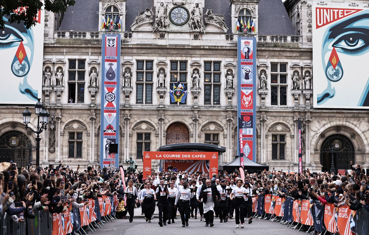 9月21日,在法国巴黎市政厅前,民众参加服务员赛跑。当日,法国首都巴黎举行具有百年历史的服务员赛跑活动。数百名穿着制服的男女服务员手托餐盘,餐盘内放着羊角面包、一个空咖啡杯和一杯水,从巴黎市政厅出发,沿环线跑完4公里的赛程。(图片来源:本文图片均自新华社)