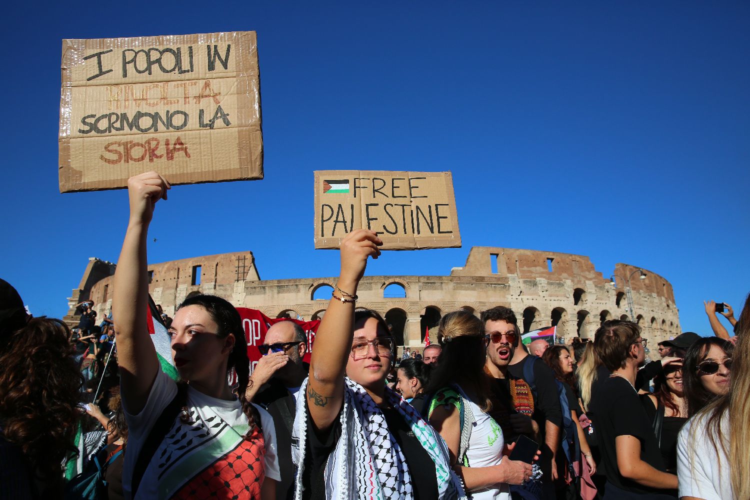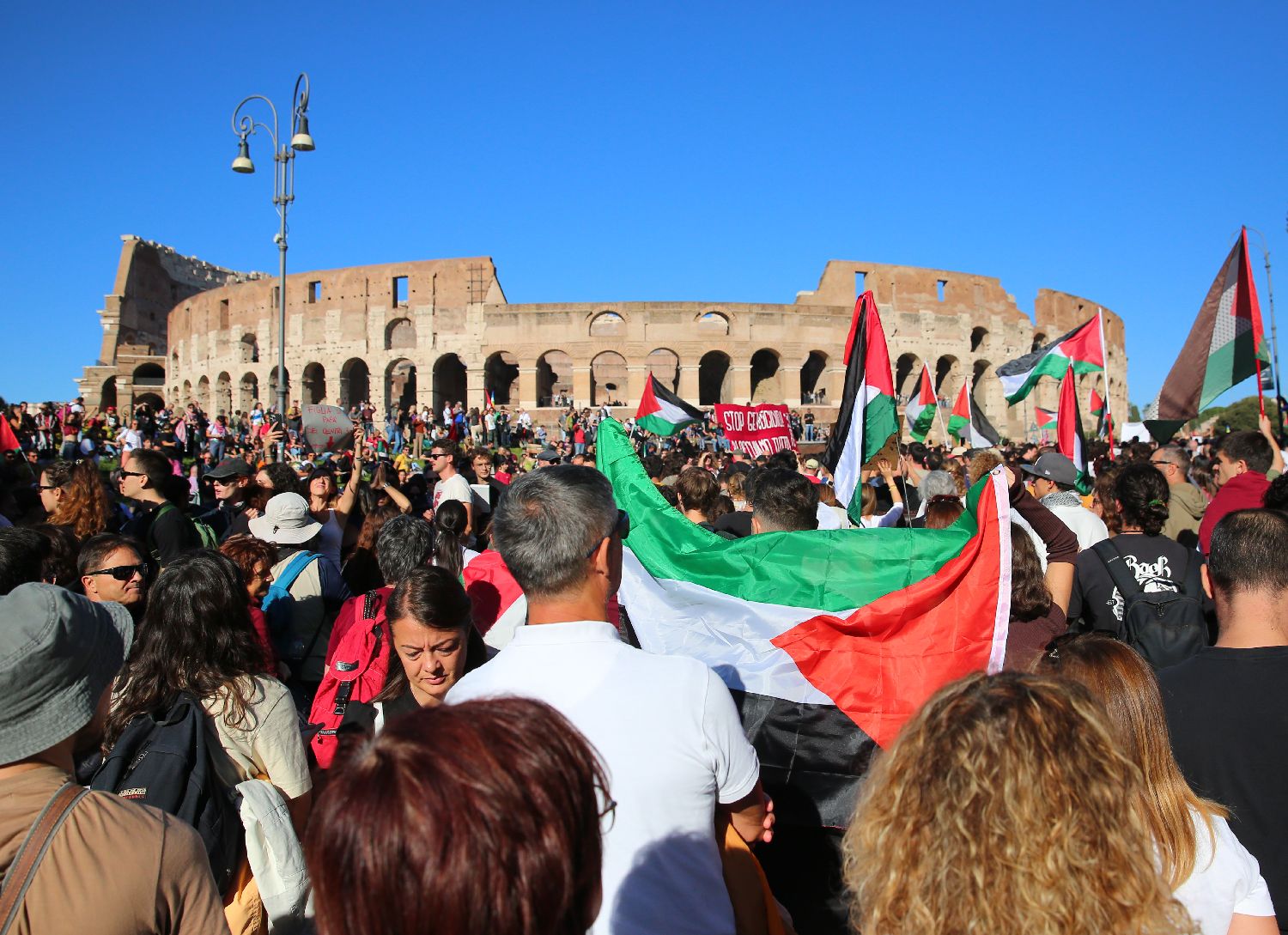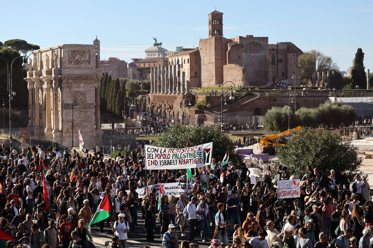 连日来,意大利多地爆发大规模抗议活动,罗马、米兰等地数万人走上街头,声援巴勒斯坦。图为10月4日,在意大利罗马,游行队伍向斗兽场行进。