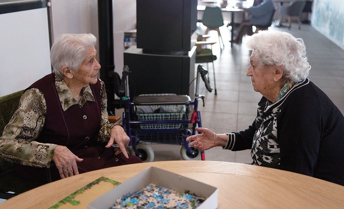 近日公布的一项由市场调研公司HarrisInteractive为法国政府战略与规划高级专员署进行的民调显示,高达73%的法国人预计,现行的分摊制退休制度到2050年很可能不复存在。图为两位老人在法国一家养老院中交谈。法新社图