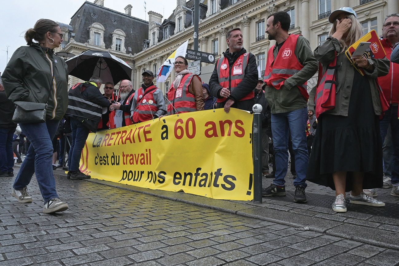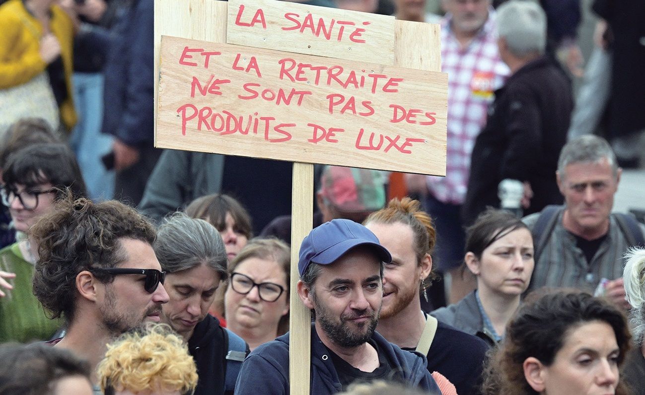 2025年9月18日,在法国雷恩举行的全国大罢工与抗议活动现场,一名示威者举着写有“健康与退休不是奢侈品”的标语牌。法新社图
