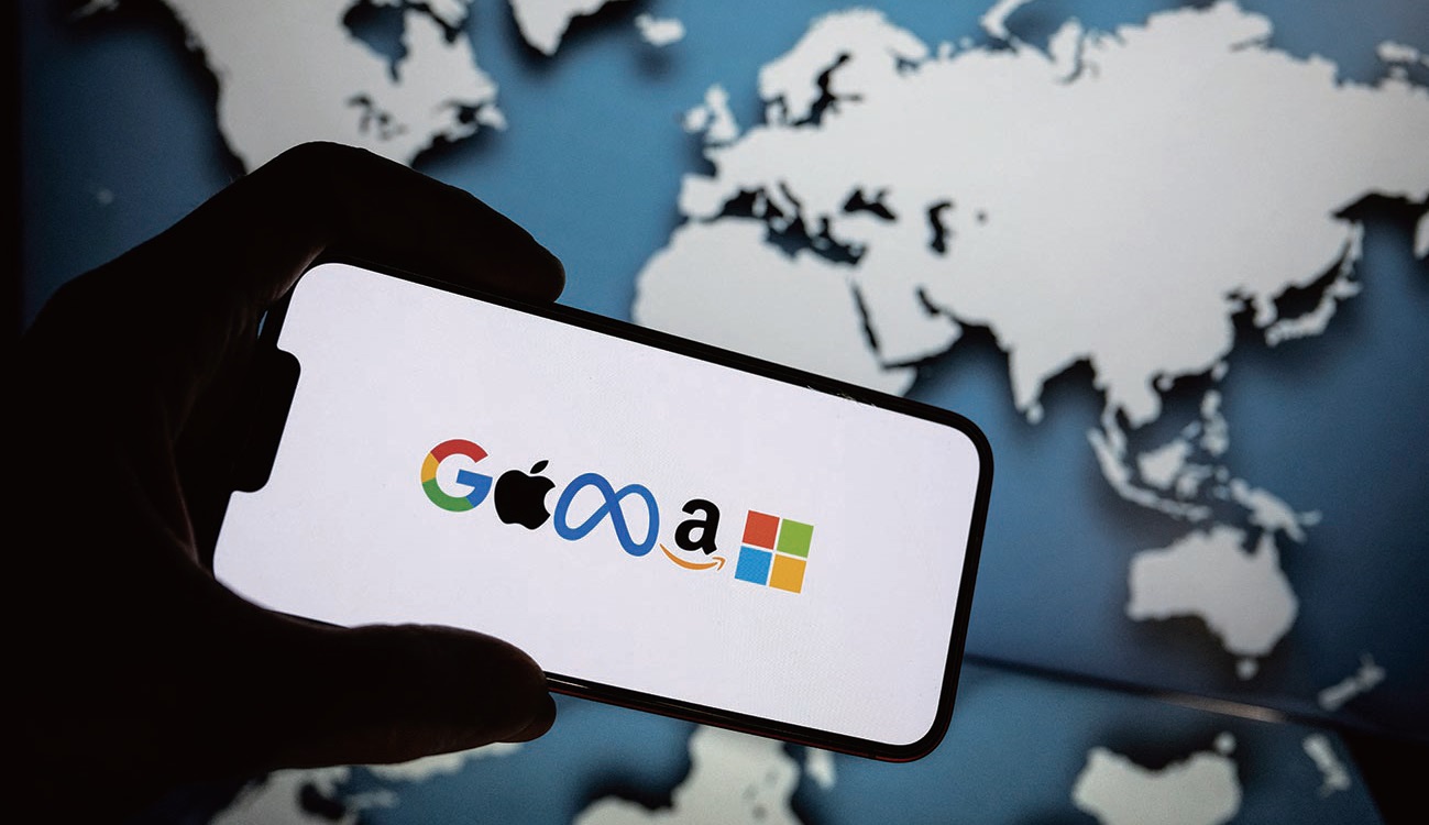 图为手机屏幕上显示的谷歌、苹果、脸书母公司Meta、亚马逊和微软的公司标识。法新社图