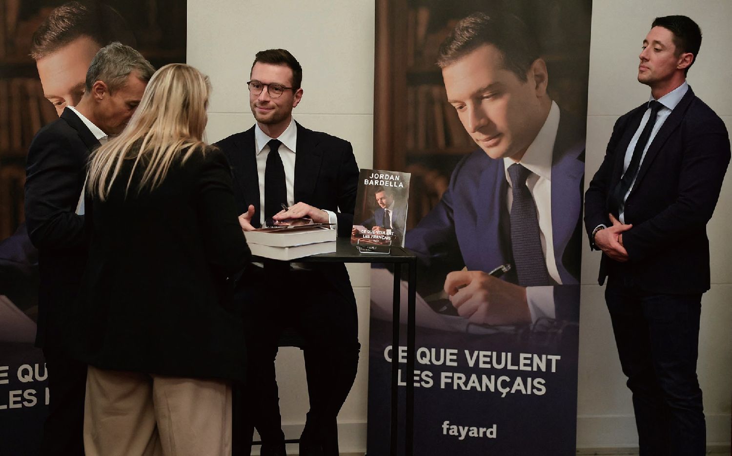 10月28日晚,刚过三十岁生日的法国极右派国民联盟党魁巴尔代拉(中)在总统府爱丽舍宫附近的马里尼剧院推出自己的新书《法国人想要什么》。他迫不及待地期待着解散议会提前举行立法选举,希望藉此立即成为总理。法新社图