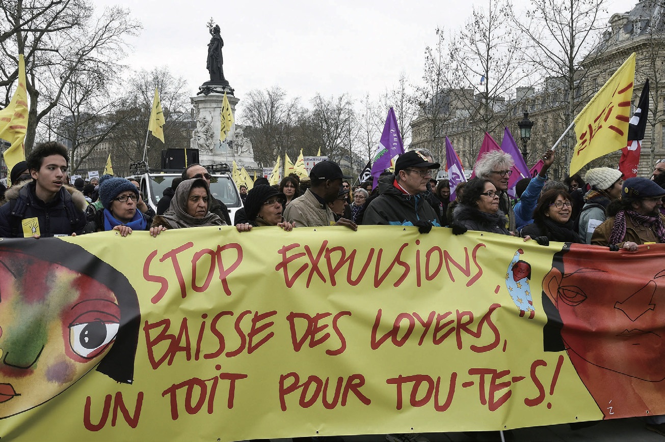 法国“居住权协会”(DAL)多年前已提出,过高的房租是造成驱逐的根源。图为在“冬歇期”刚刚结束的2016年4月2日,该协会在巴黎共和国广场发起反驱逐示威,抗议者举着写有“停止驱逐、降低房租、人人有屋顶”的横幅。法新社资料图