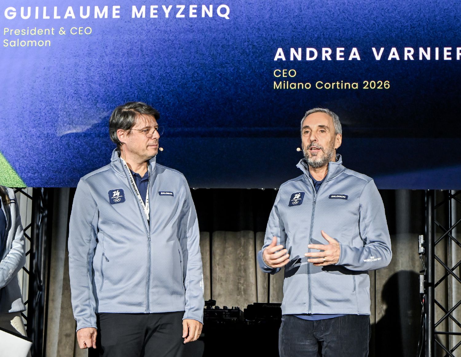 11月12日,米兰冬奥会组委会首席执行官安德烈亚·瓦尼尔(右)在发布活动上发言。