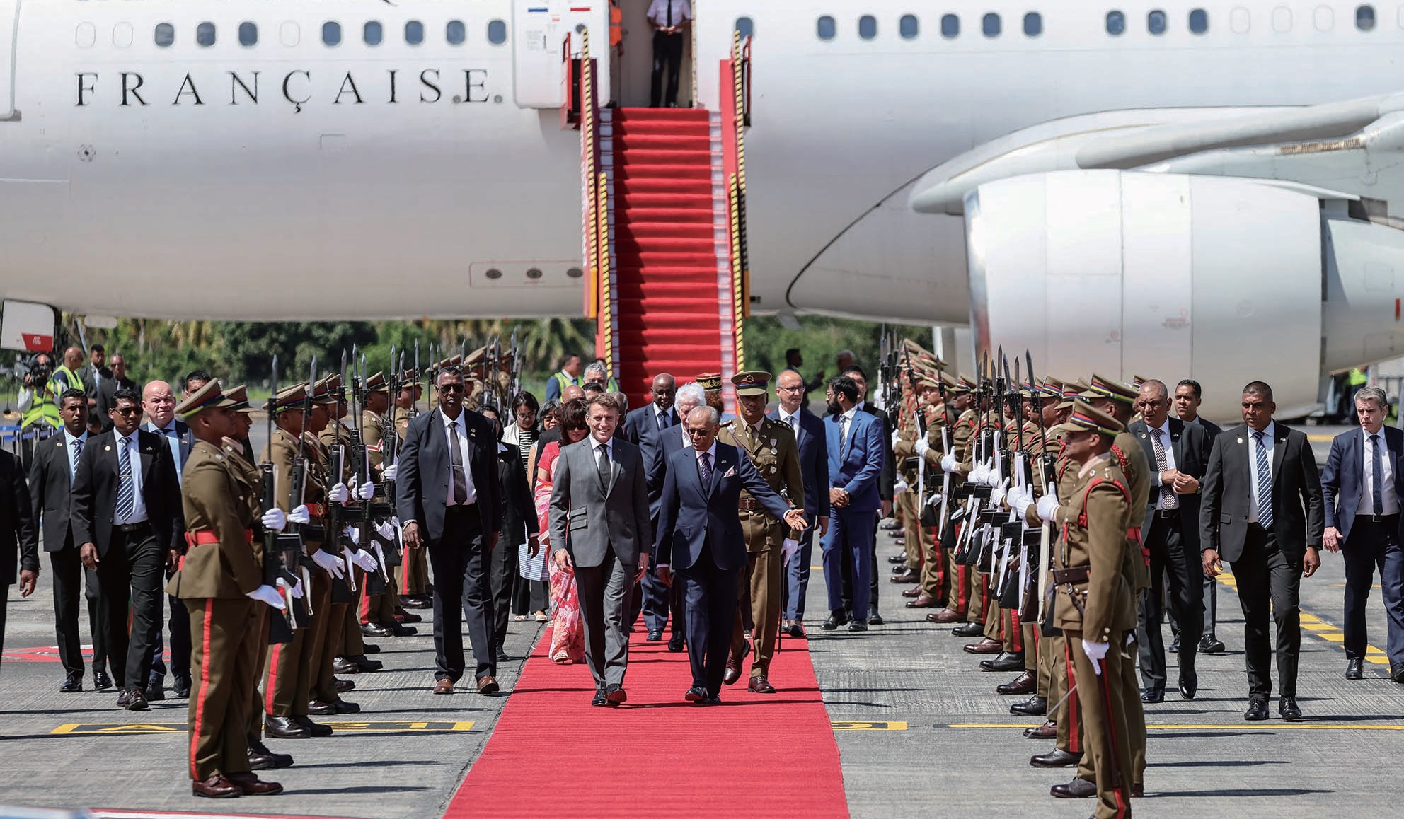图为马克龙11月20日抵达路易港的塞维萨古尔·拉姆古兰国际机场,毛里求斯总理纳温·拉姆古兰在机场迎接。法新社图