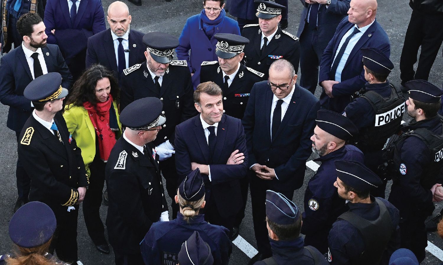 12月16日,马克龙总统(中)在走访马赛期间,出席马赛第13区新警察局的落成典礼,与警员交流。法新社图