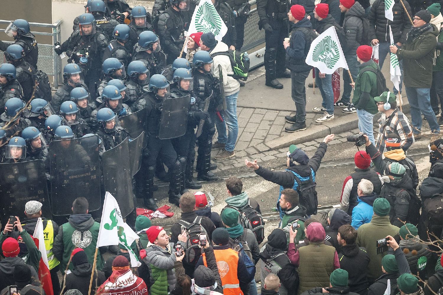1月21日,欧洲议会将投票决定是否将协定提交欧盟法院,由后者确定该协定是否符合欧盟相关规定。图为示威农民与法国宪兵队对峙。法新社图