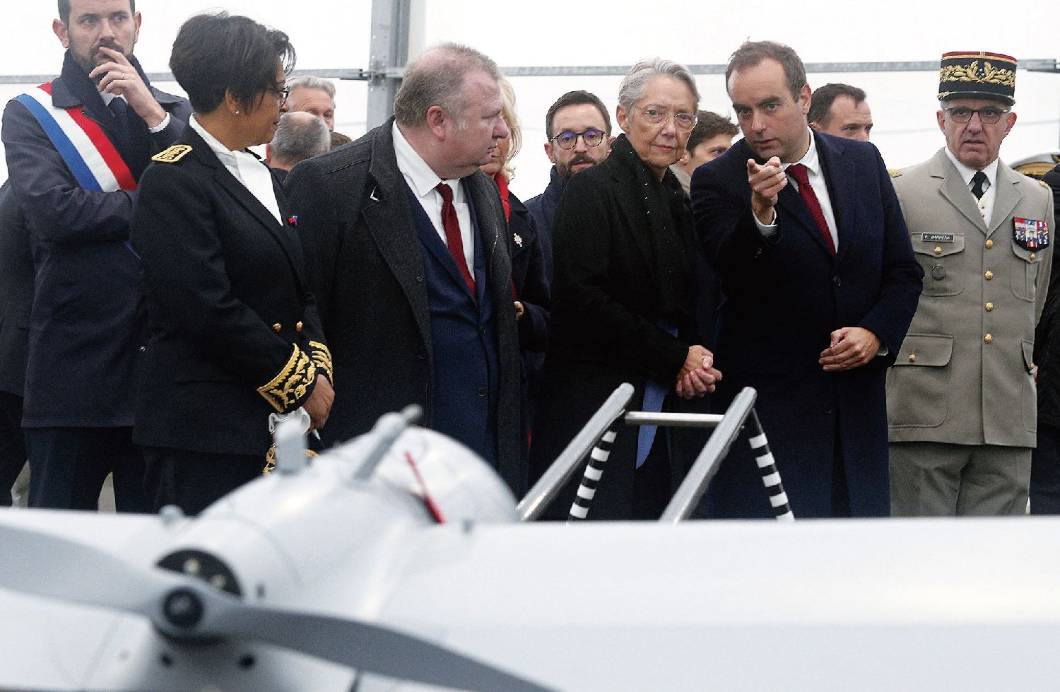 法国政府对军用无人机的重视并非始于今日,这是2023年10月26日,当时担任国防部长的现任法国总理勒科尔努(右二)陪同时任法国总理博尔内(右三)出席设在肖蒙-塞穆捷第61炮兵团的法国陆军作战无人机学校的落成典礼。法新社图