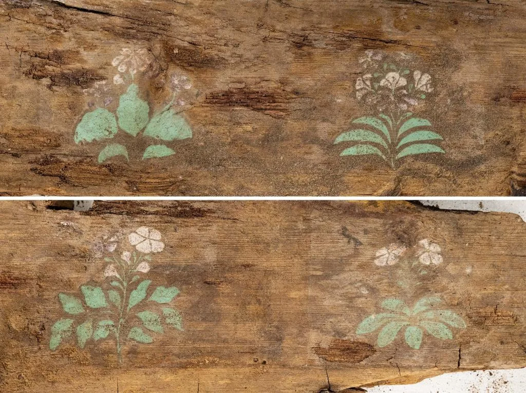 拼版照片:这是在实验室考古方舱内拍摄的墓葬M20出土棺板上的彩绘花卉图案(2月1日摄)。
