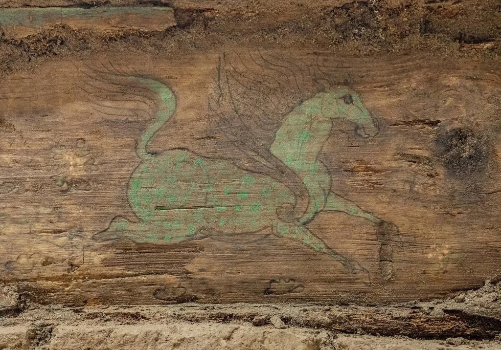 这是在实验室考古方舱内拍摄的墓葬M20出土的木棺座壸门内的彩绘“翼马”图案(2月1日摄)。