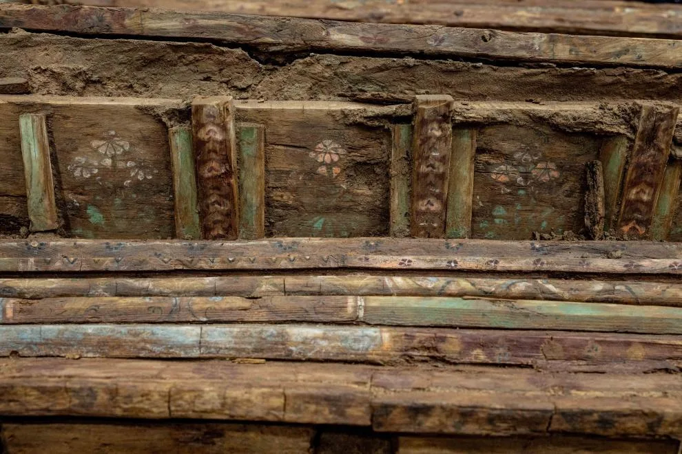 据中国社会科学院科技考古与文化遗产保护重点实验室副研究员刘勇介绍:该墓经科技考古人员通过套箱整体移至实验室内清理保护。目前已清理出木棺具、木屏风、木榻、木箱等遗物。其中,保存完整的彩绘木棺座以及带有彩绘和文字的木屏风等文物十分罕见。彩绘木棺座南北两侧对称各分布6个壸门,壸门内彩绘形态各异的“瑞兽”,壸门上方为叠涩结构并绘制有精美的瑞草。经科学测年并向相关领域专家咨询,初步判定该墓为唐中期葬于西州(今新疆吐鲁番)地区的高等级官员墓,结合墓葬形制,初步推断为三品官员。