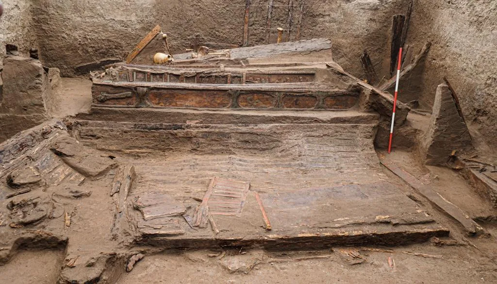 墓葬M20经初步揭露时墓内木榻和彩棺等的陈设布局情况(资料照片)。