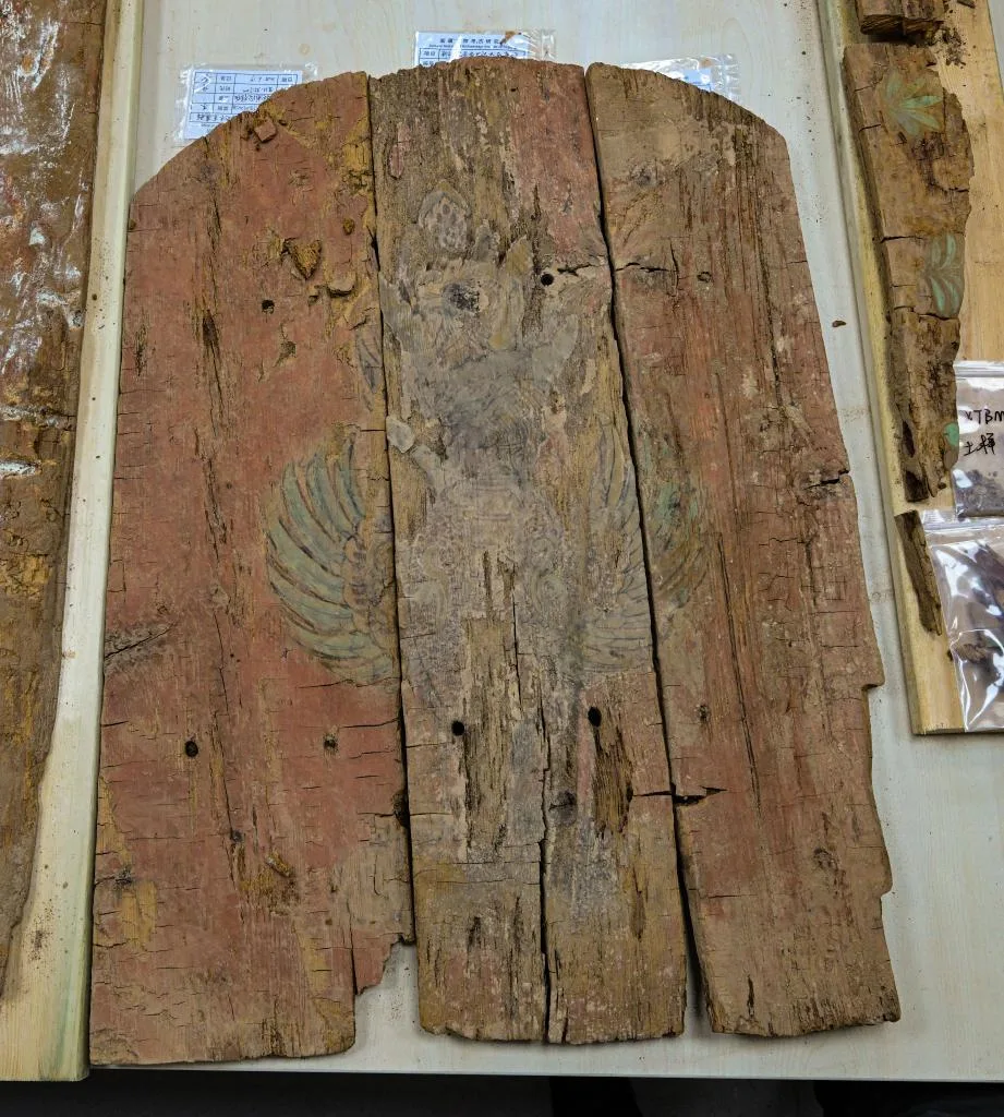 这是在实验室考古方舱内拍摄的彩绘着朱雀图案的木棺前档(2月1日摄)。