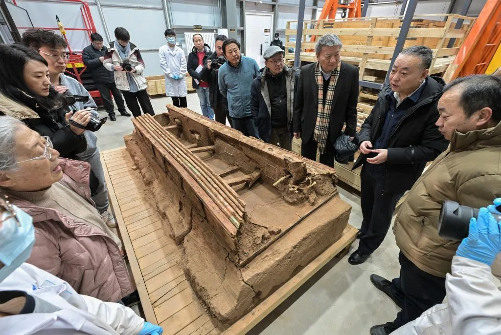 专家们在实验室考古方舱内察看墓葬M20出土的完整木榻(2月1日摄)。